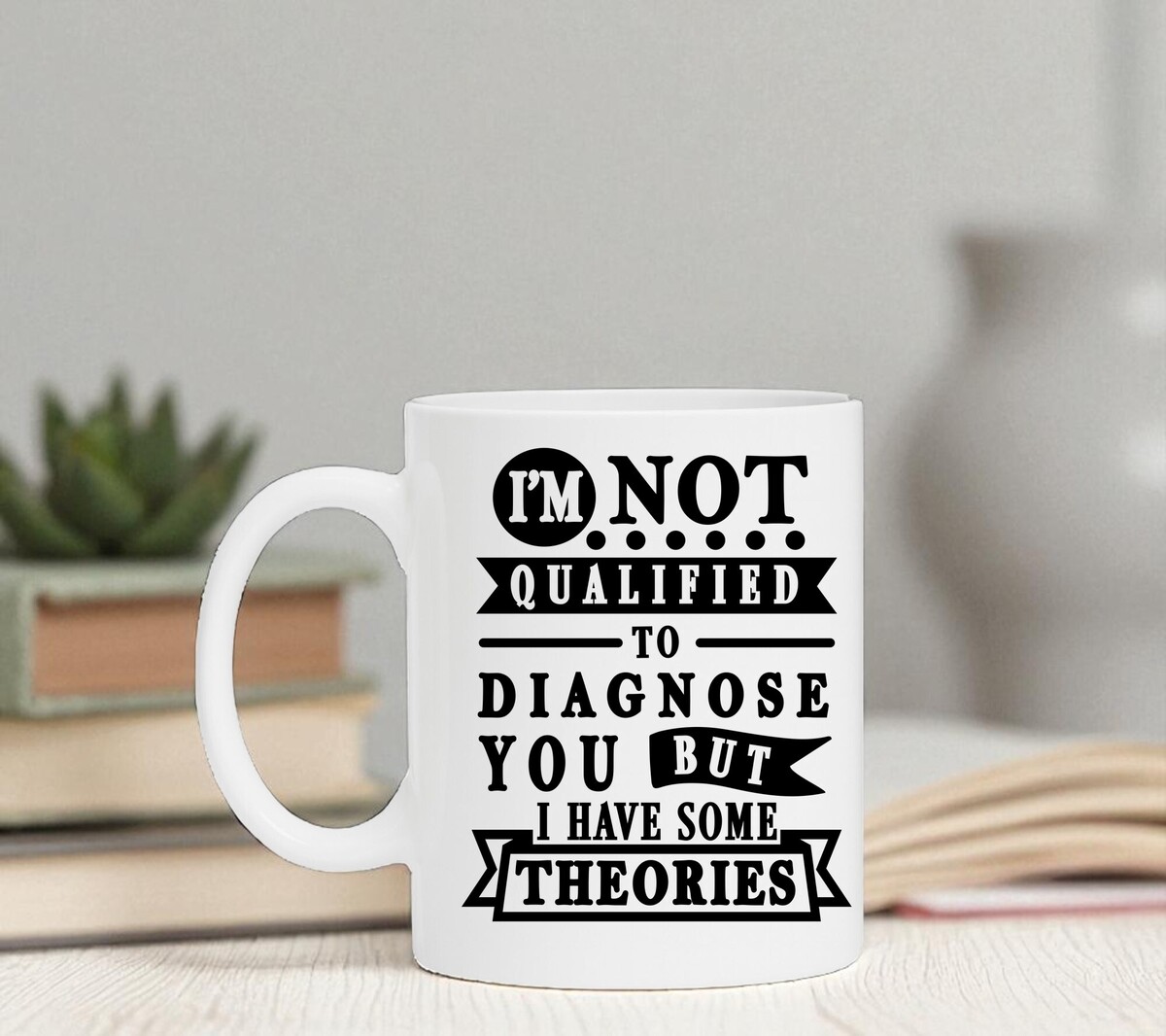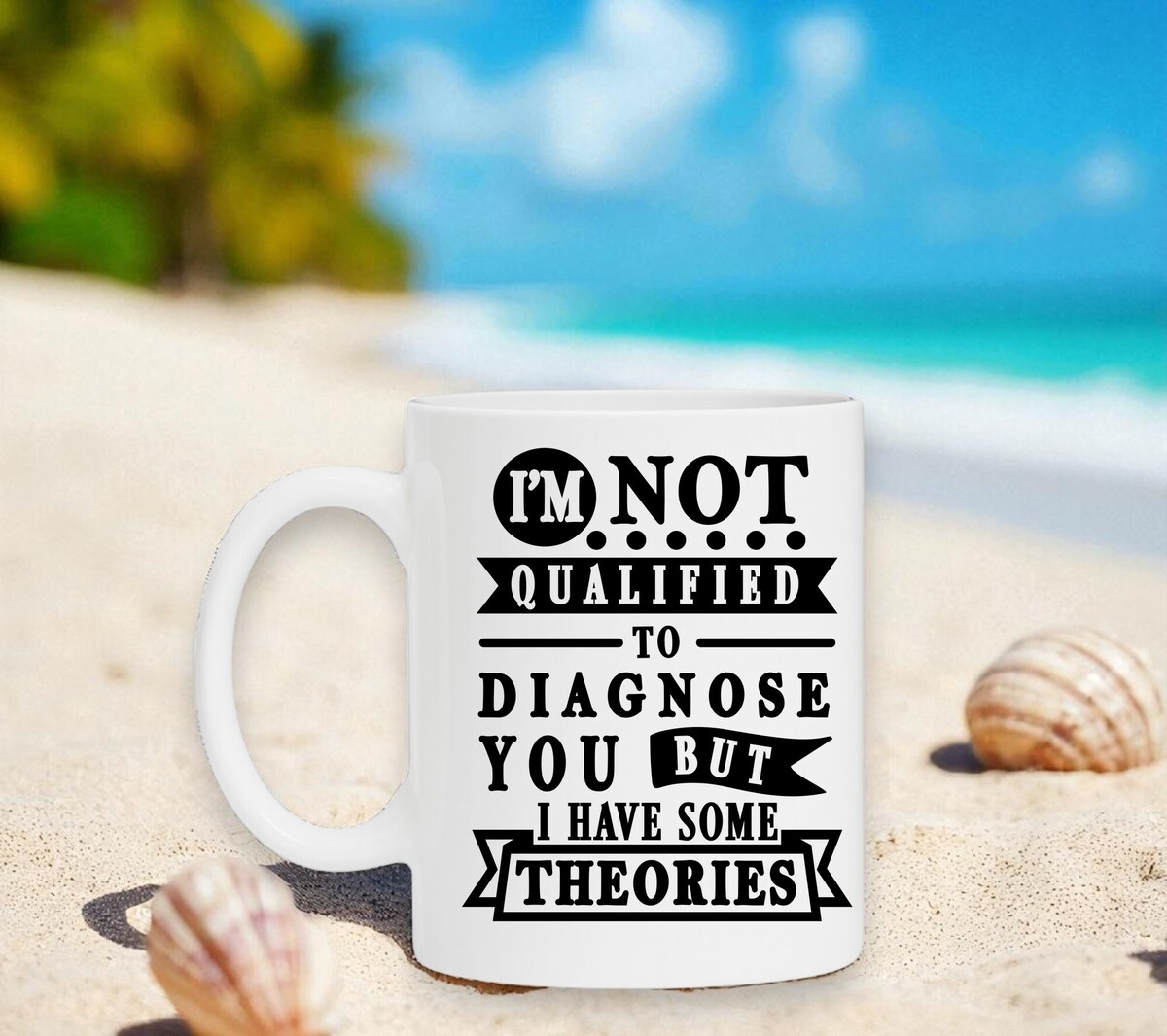 Witte koffie of thee mok met de tekst i'm not qualidied to diafnose you but i have some theories. De mok is vaatwasserbestendig, microgolfbestendig en heeft een hoogte van 96mm en een diameter van 80mm.