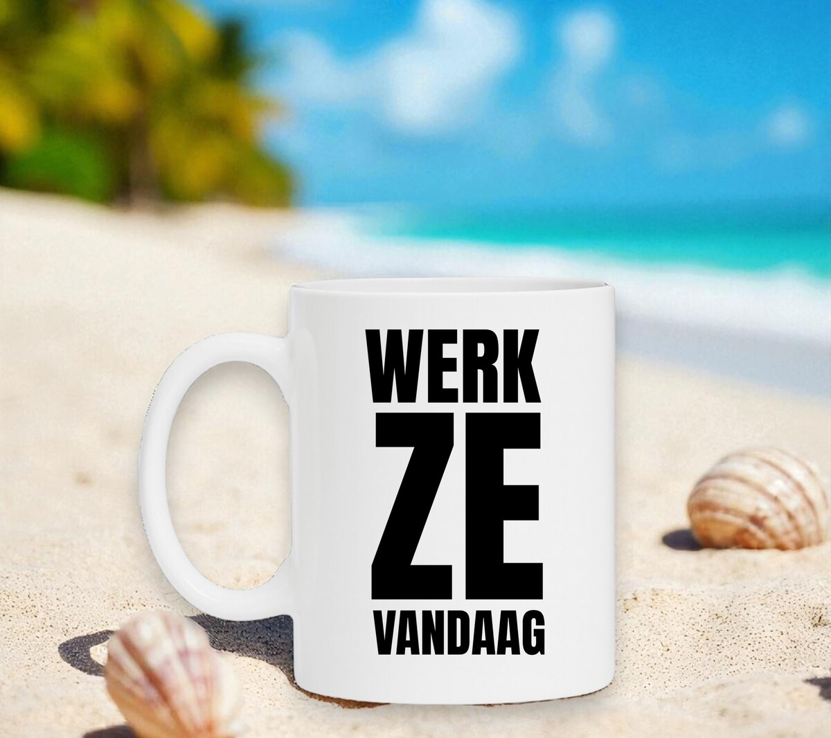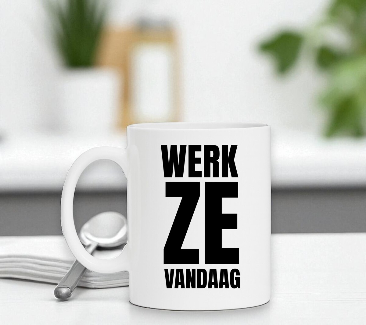 Witte koffie of thee mok werk ze vandaag. De mok is vaatwasserbestendig en magnetronbestendig. De mok heeft een hoogte van 96mm en een diameter van 80mm