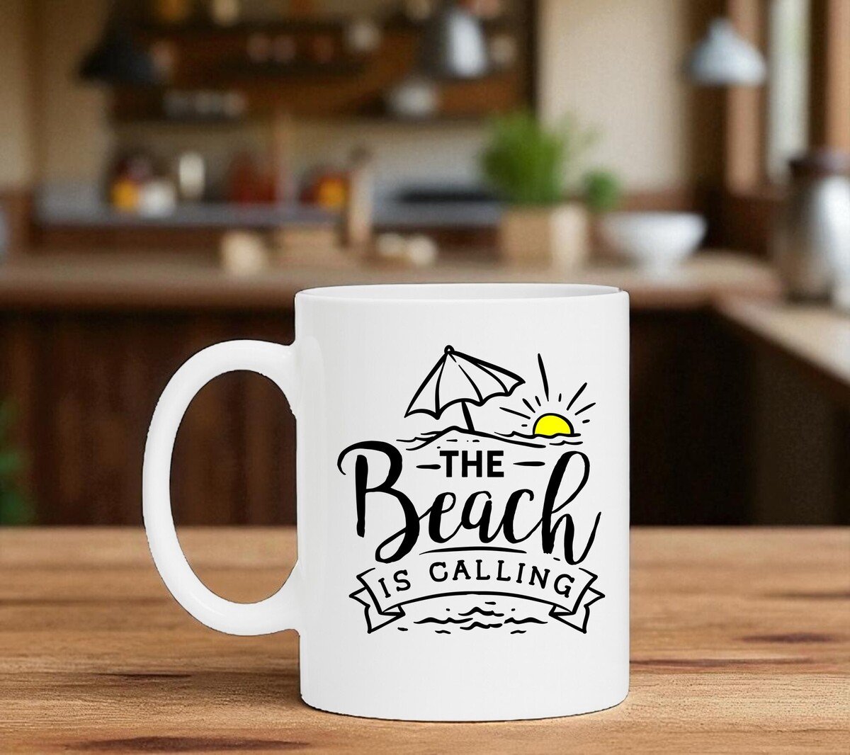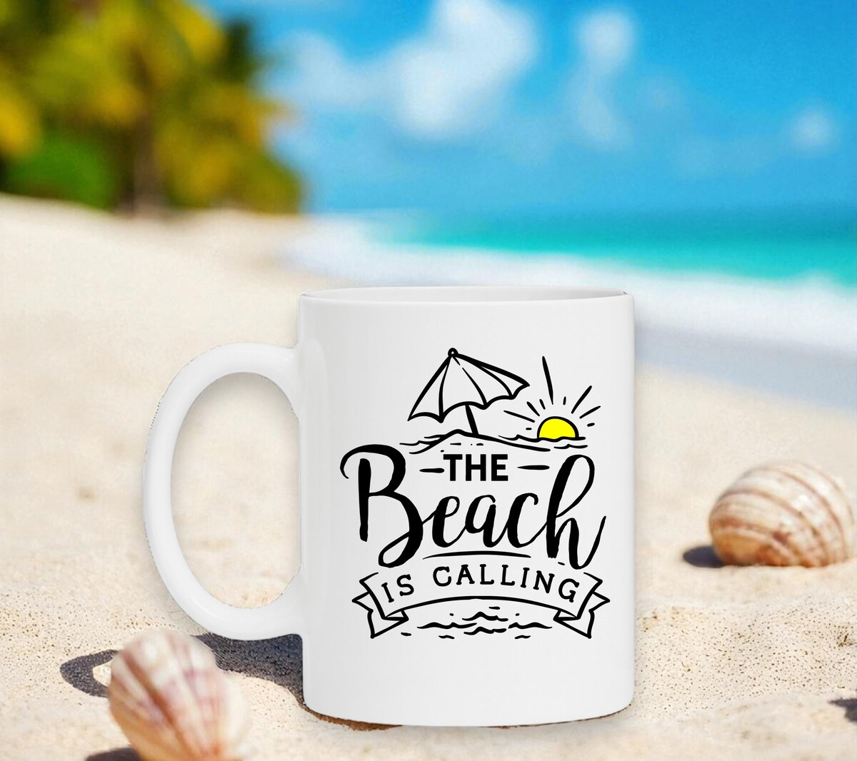 Witte koffie of thee mok met de opdruk 'Beach is calling'. De mok is vaatwasserbestendig, microgolfbestendig en heeft een hoogte van 96mm en een diameter van 80mm.