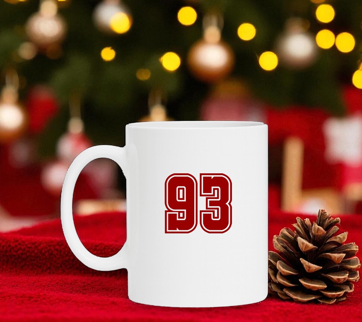 Een fraaie witte mok met het cijfer 93 als opdruk in de kleur robijnrood. Hoogte mok 9cm.