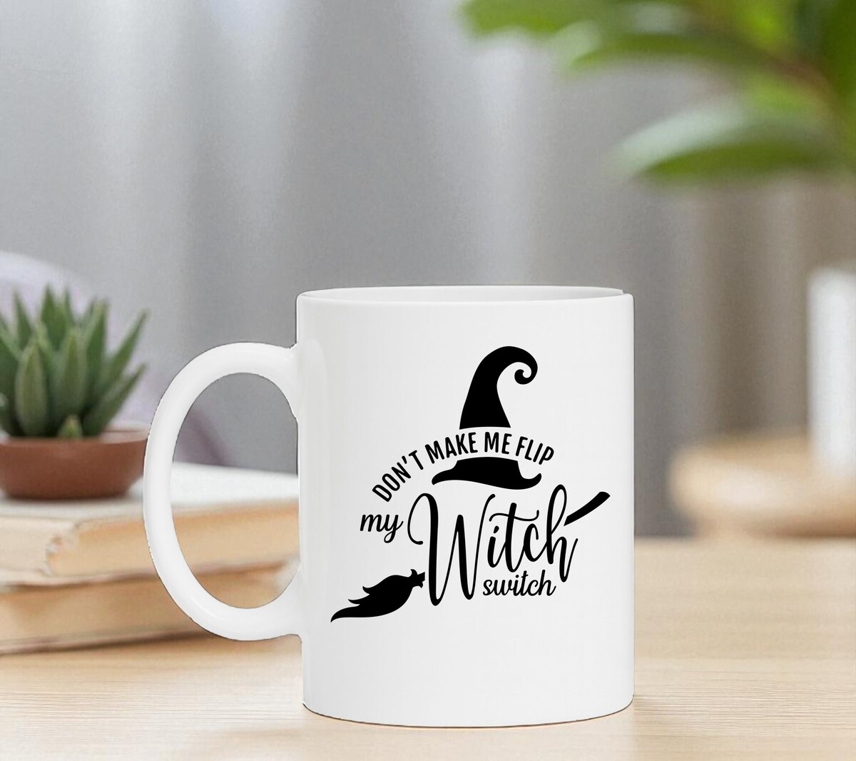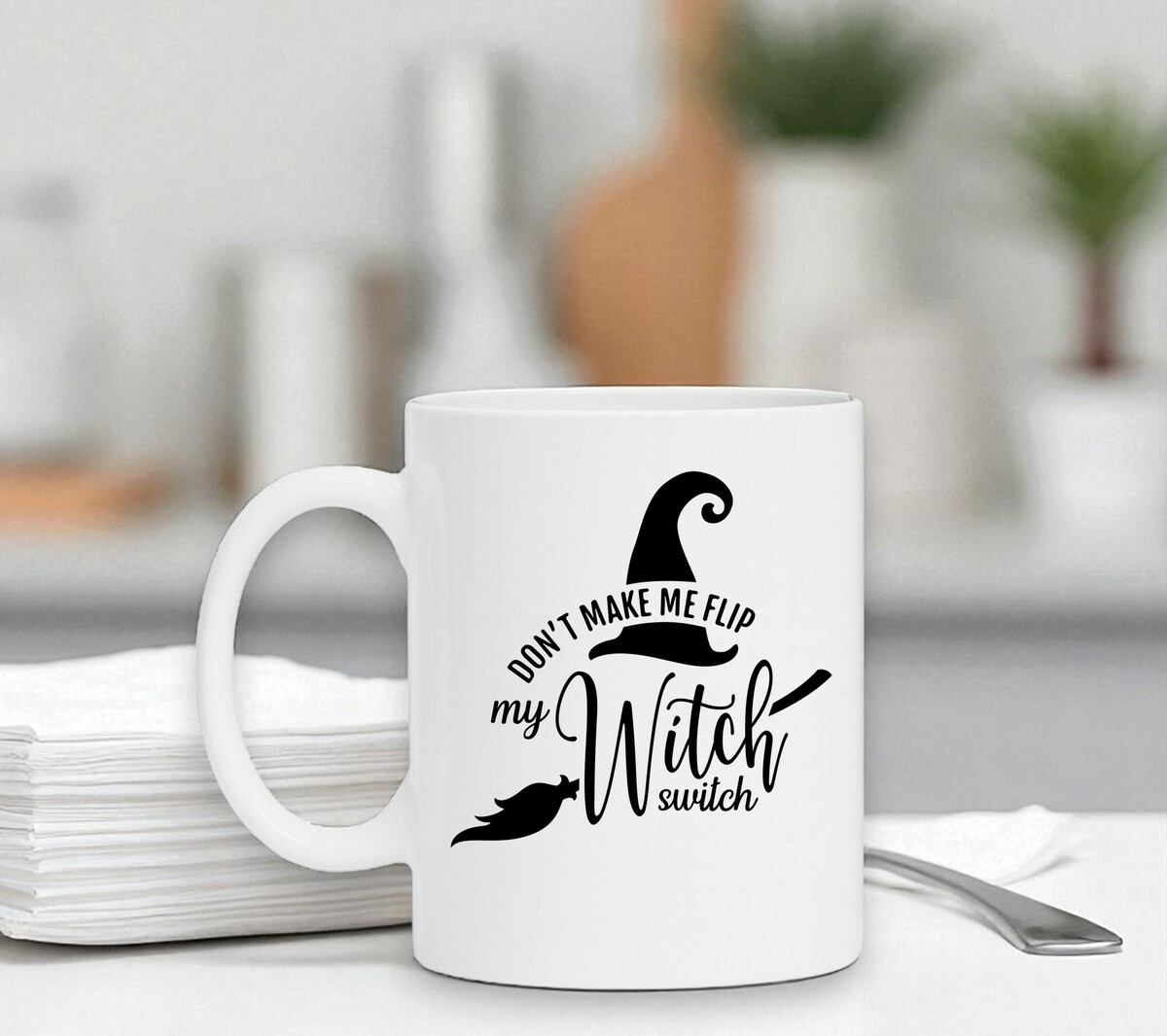Mooie koffie of thee mok voor bij Halloween. Op de Halloween mok staat de print don't make me flip my witch switch. De mok is vaatwasserbestendig en heeft een hoogte van 96mm en een diameter van 80mm.