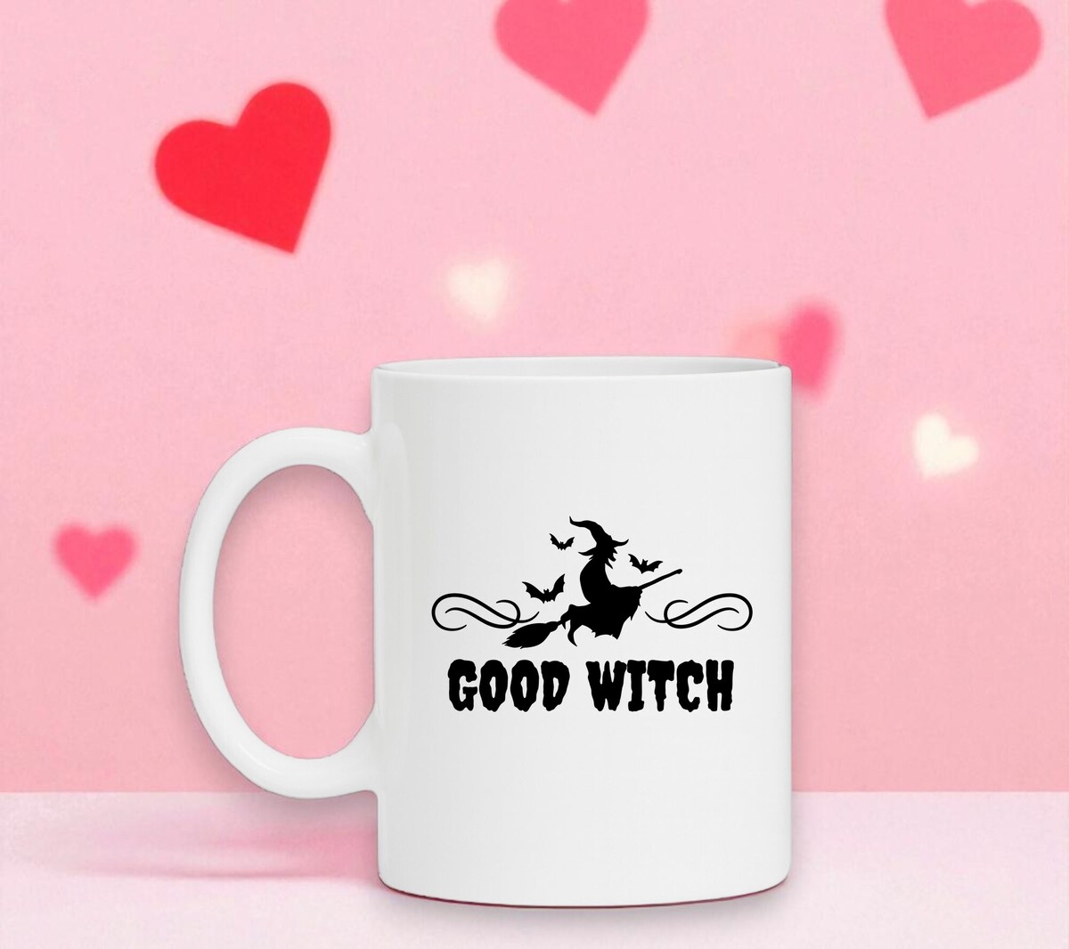 Witte mok Halloween good witch. De mok is vaatwasserbestendig en heeft een hoogte van 96mm en een diameter van 80mm.