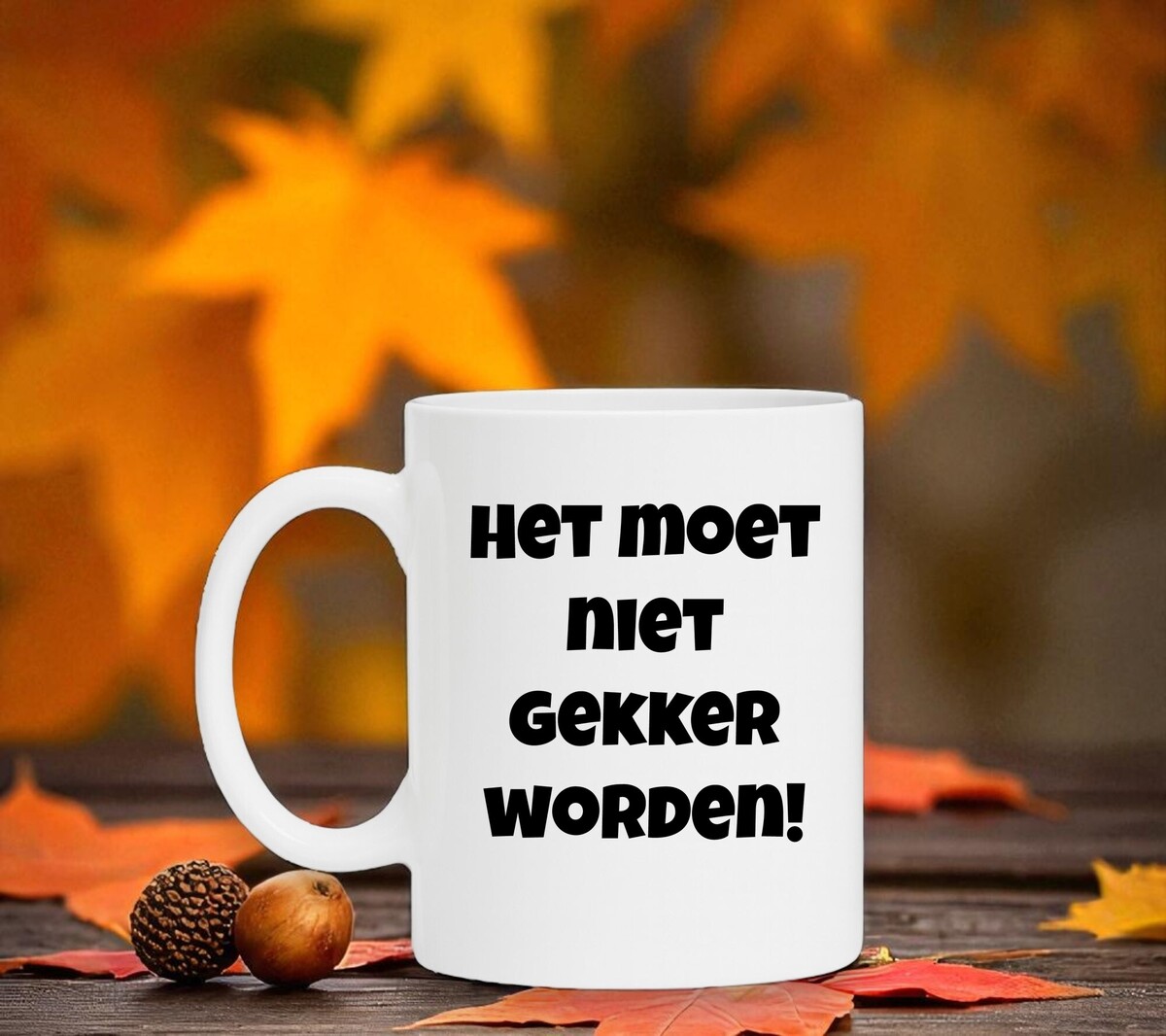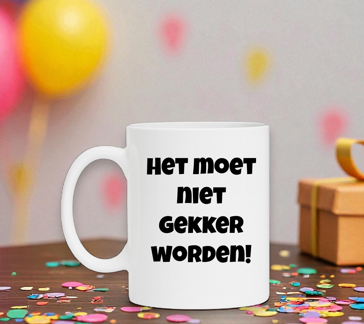 Witte mok met de opdruk het moet niet gekker worden! De witte koffie of thee mok is vaatwasserbestendig en magnetronbestendig. De mok heeft een hoogte van 96mm en een diameter van 80mm.