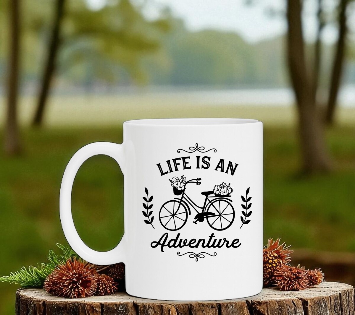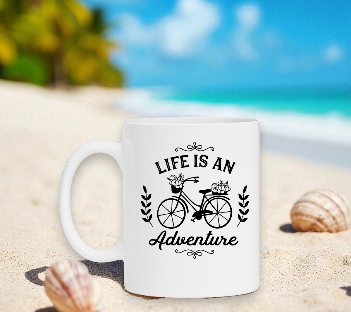 Witte koffie of thee mok met de opdruk 'life is an adventure'. Het leven is een avontuur. De mok is vaatwasserbestendig en magnetronbestendig en heeft een hoogte van 96mm en een diameter van 80mm.
