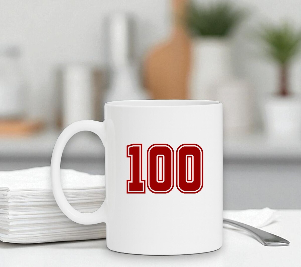 Een mooi wite mok met het cijfer honderd als opdruk in de mooie diepe rode kleur robijnrood.