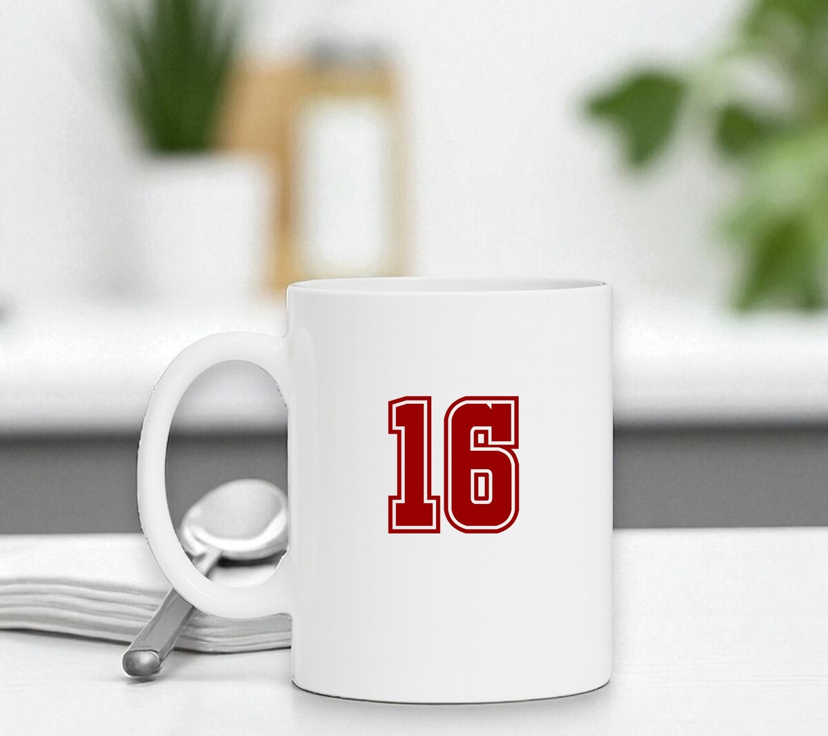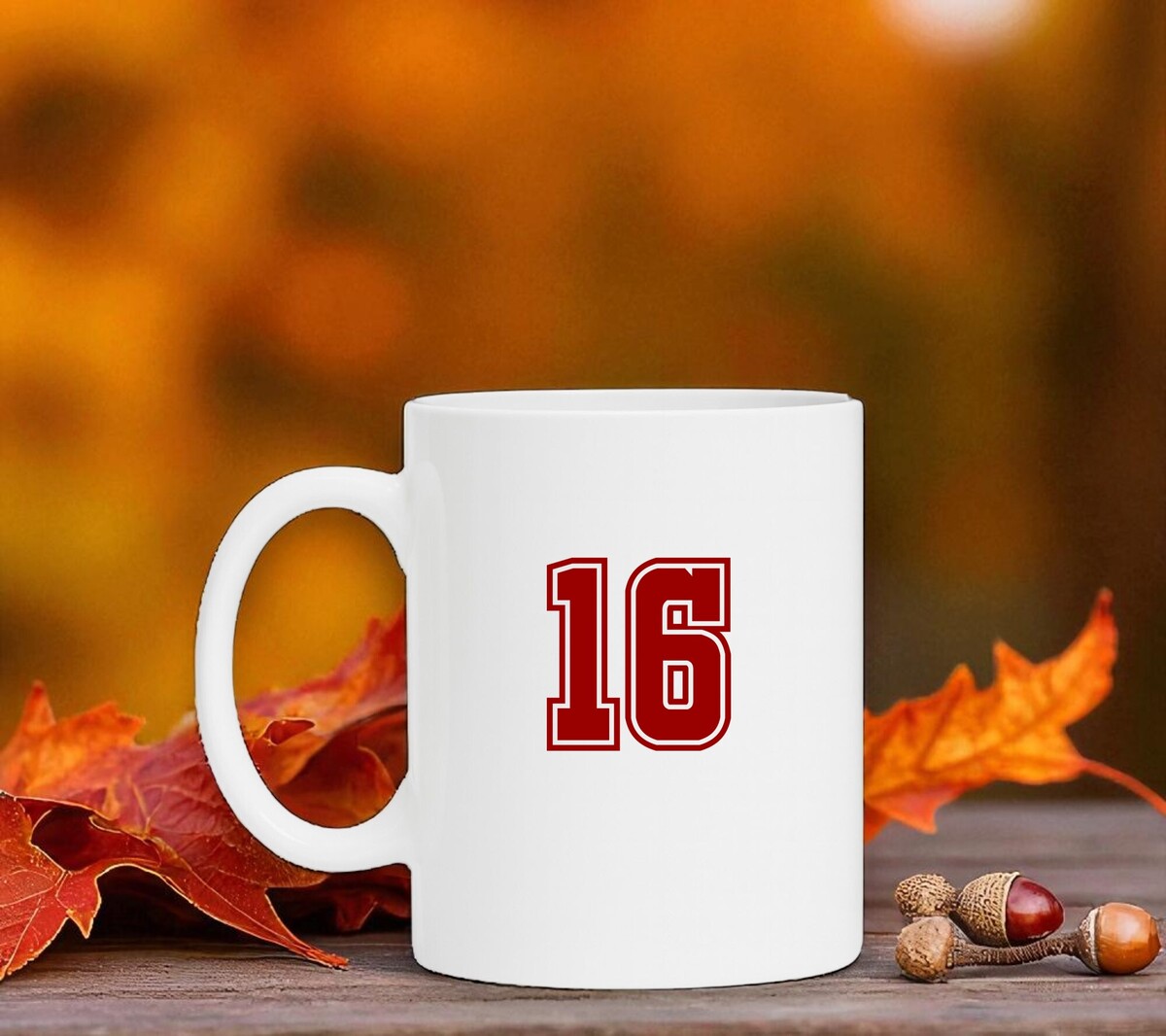 Witte mok met het getal 16 als opdruk. Hoogte mok 9cm. Opdruk robijnrood.