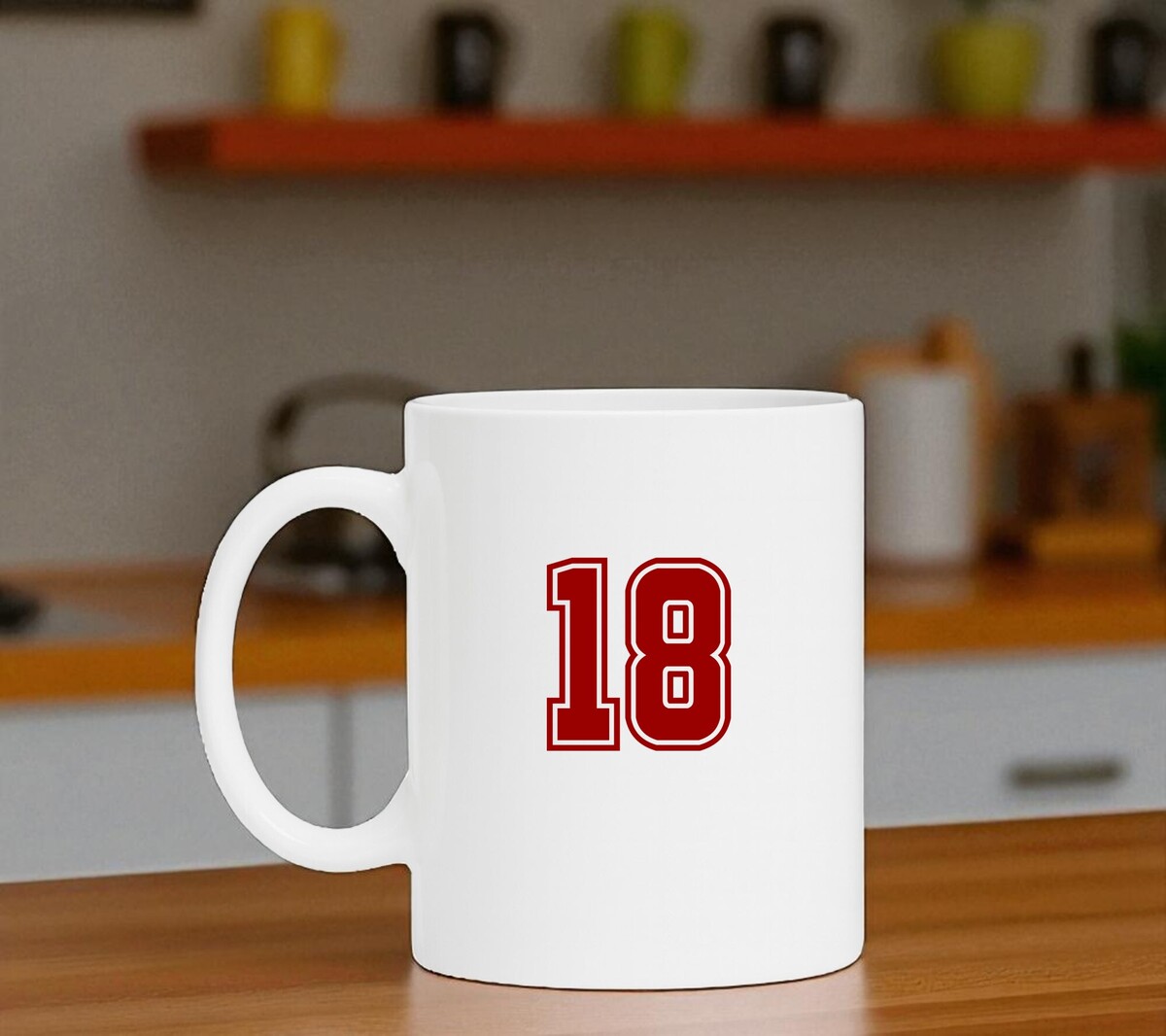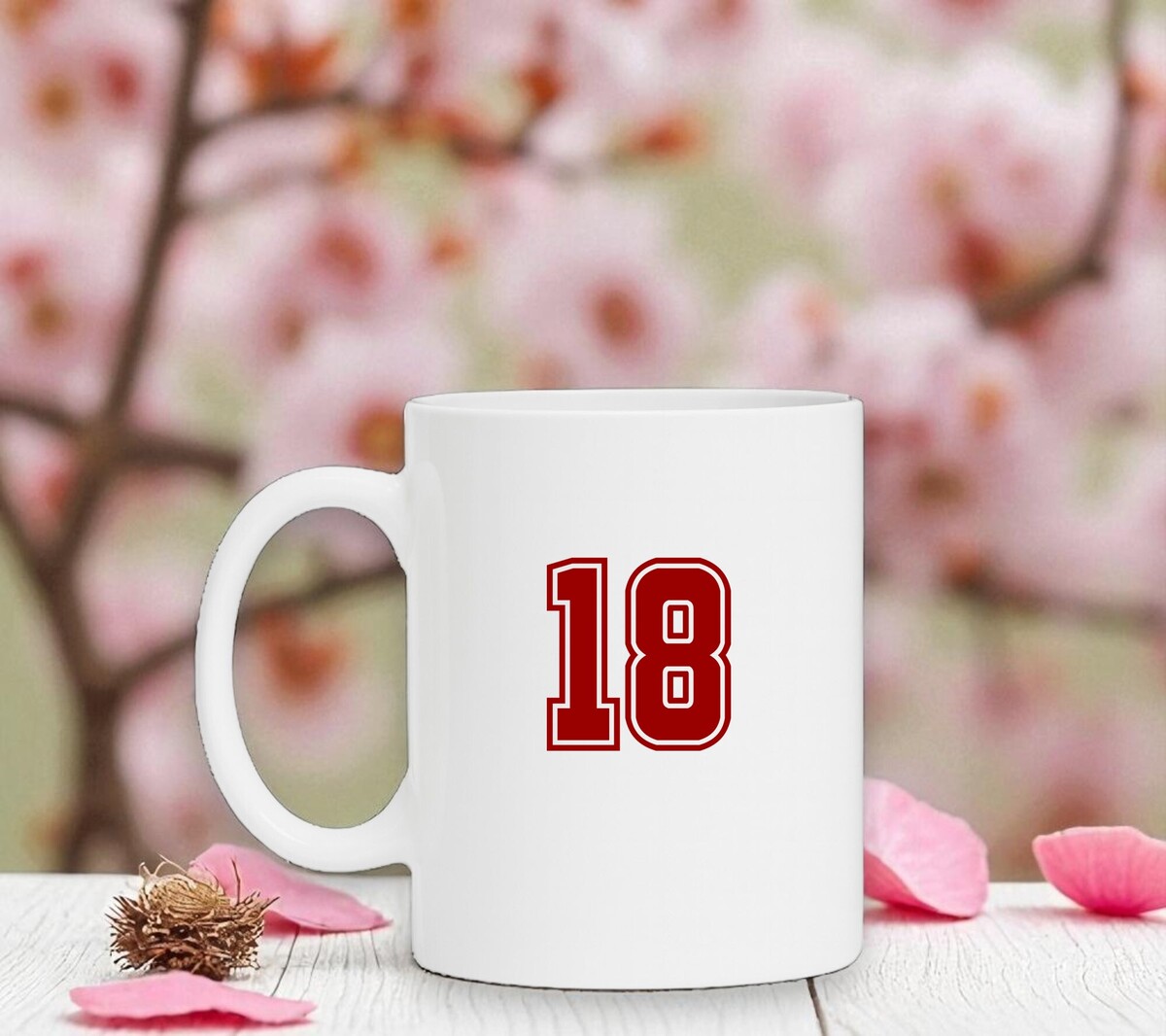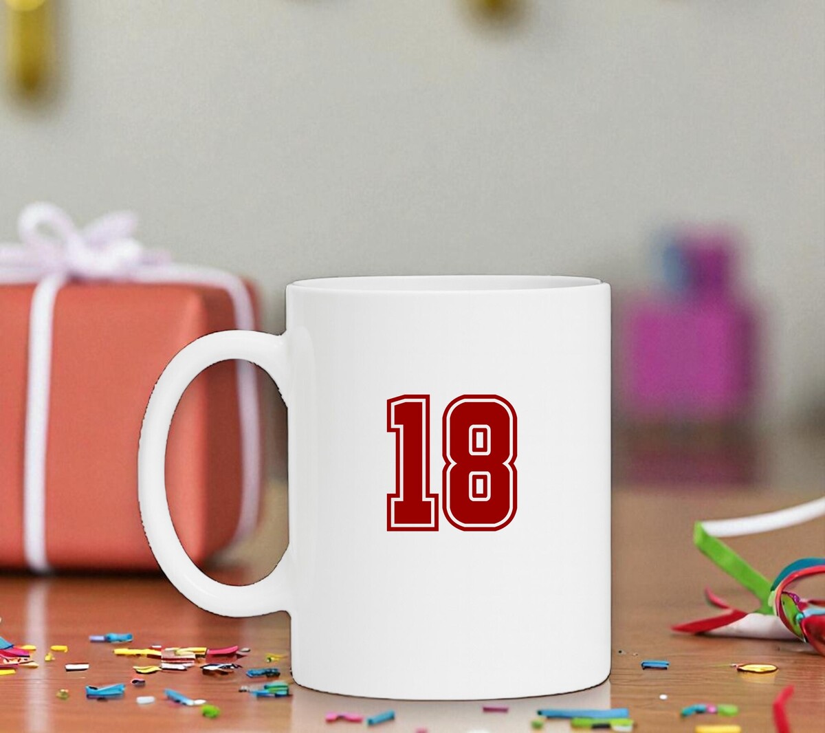Witte mok met het getal 18 als opdruk. Hoogte mok 9cm. Kleur opdruk robijnrood.