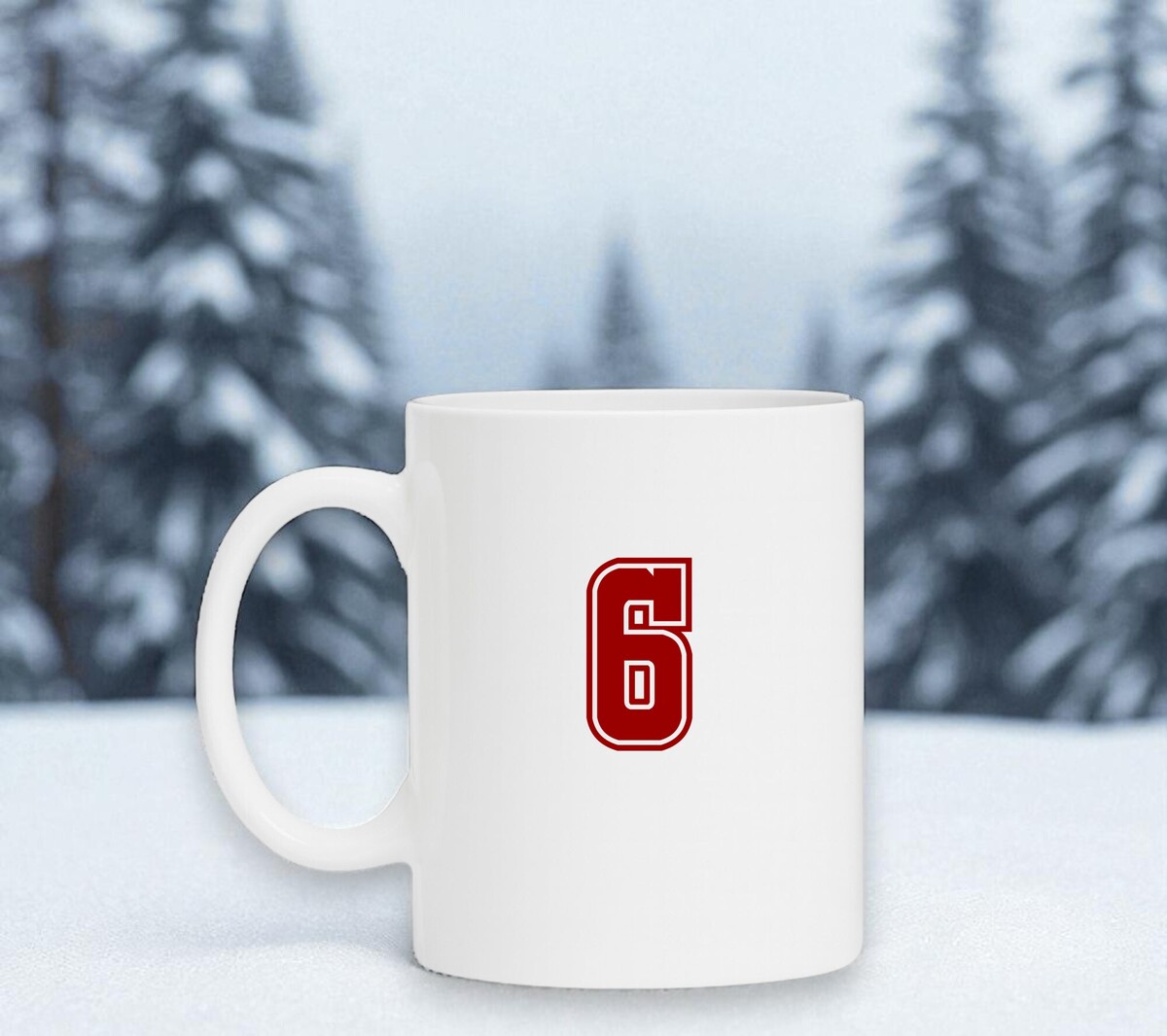 Witte mok met het getal 6 erop in de kleur robijnrood.