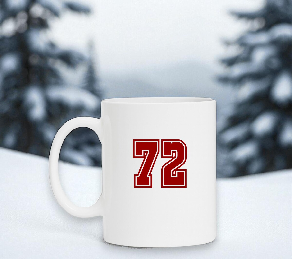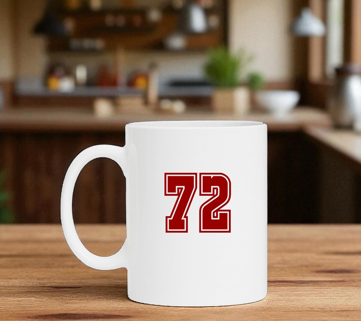 Witte mok met het getal 72 als opdruk in de kleur robijnrood.
