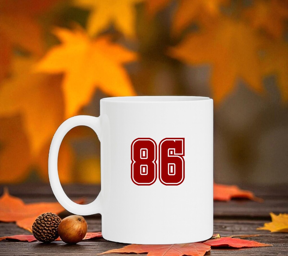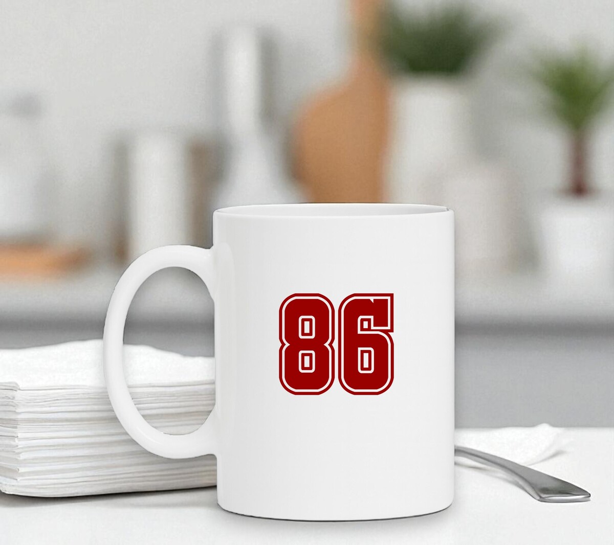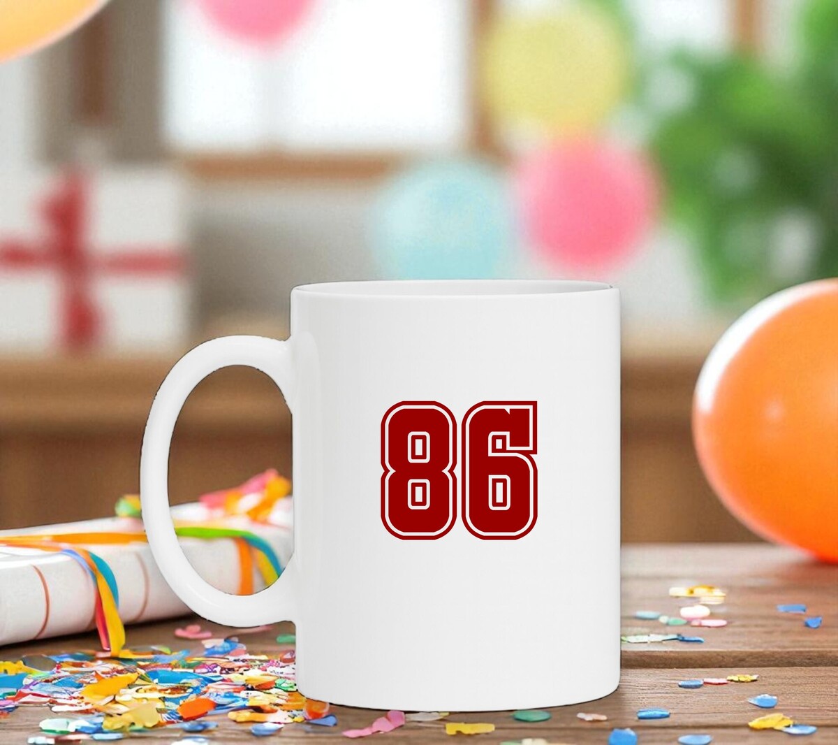 Witte mok met het getal 86 erop gedrukt in de kleur robijnrood. De hoogte van de mok is 9cm.