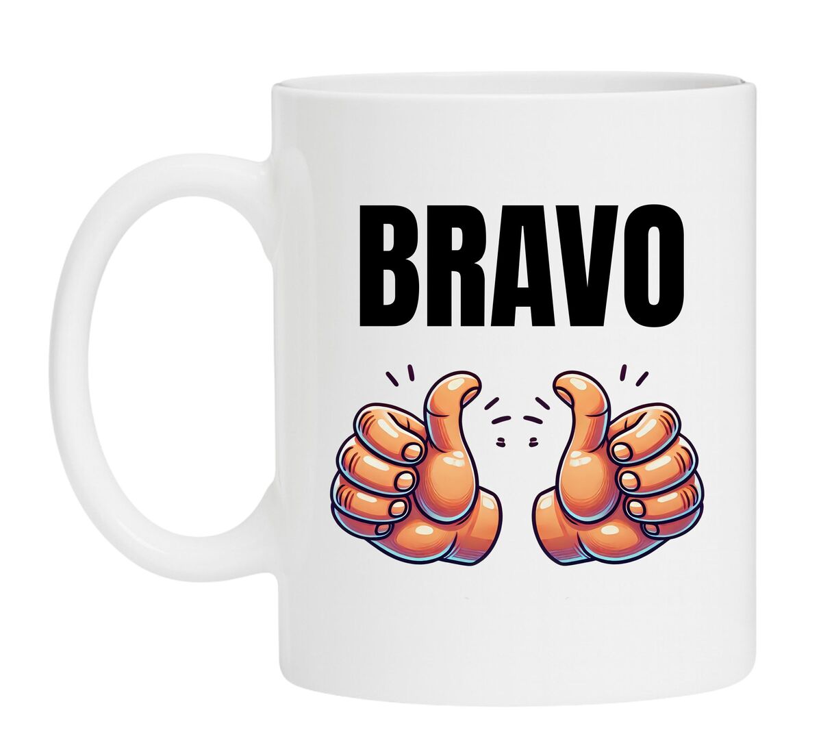 Soms zegt een simpel “Bravo!” alles. Deze vrolijke witte mok met de tekst “Bravo” en twee juichende duimen is hét perfecte cadeautje om iemand in het zonnetje te zetten. Of het nu gaat om een geslaagde prestatie, een verjaardag, een nieuwe baan of gewoon omdat iemand een compliment verdient – met deze mok geef je een dagelijks stukje waardering en positiviteit.
