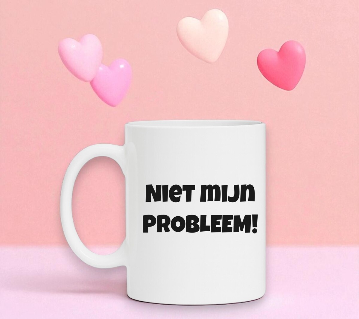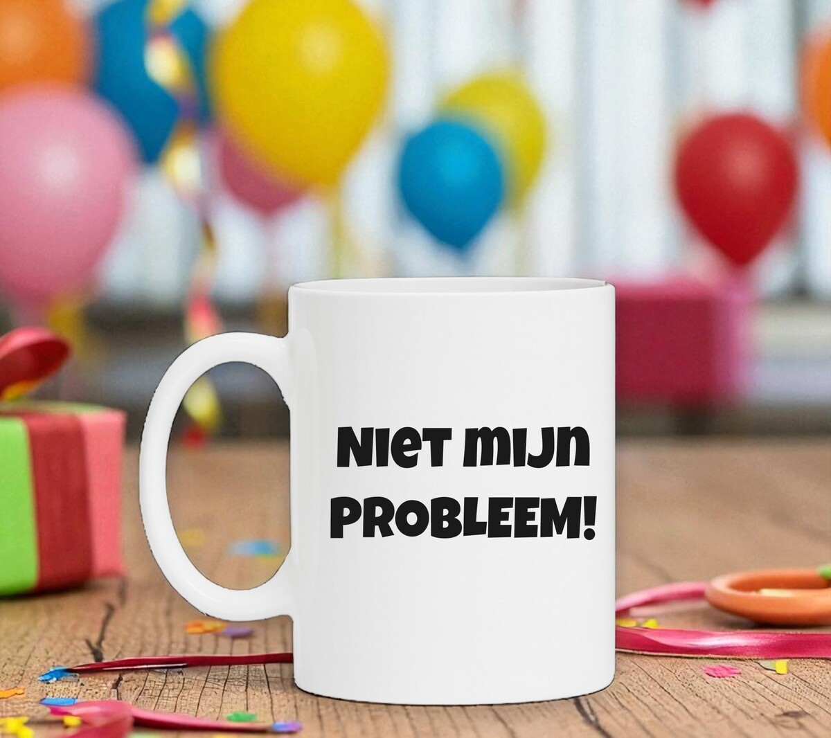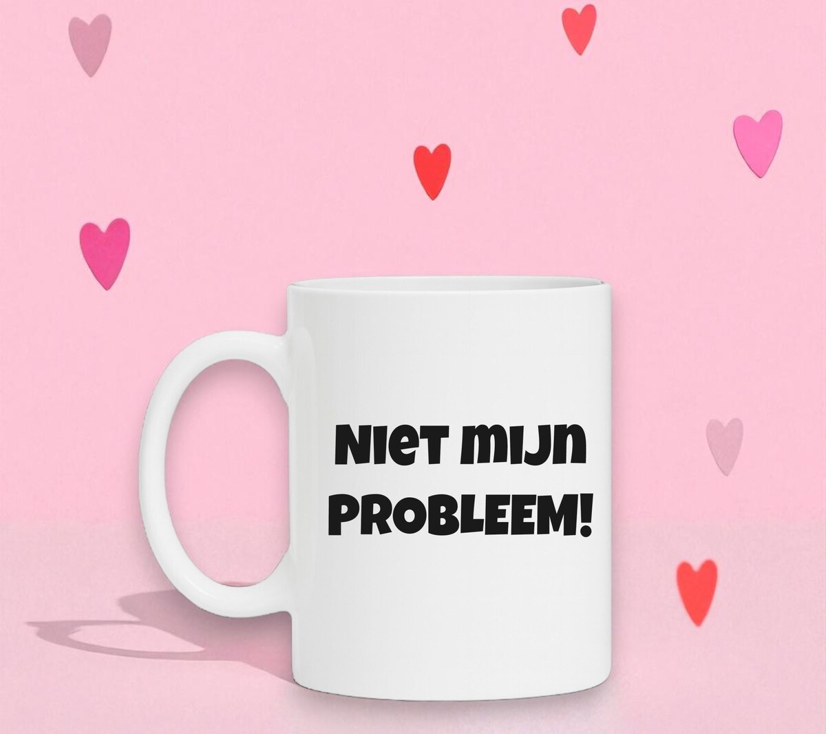 Koffie of thee mok met de opdruk 'Niet mijn probleem'. De mok is magnetron en vaatwasserbestendig en de witte mok heeft een hoogte van 96mm en een diameter van 80mm.