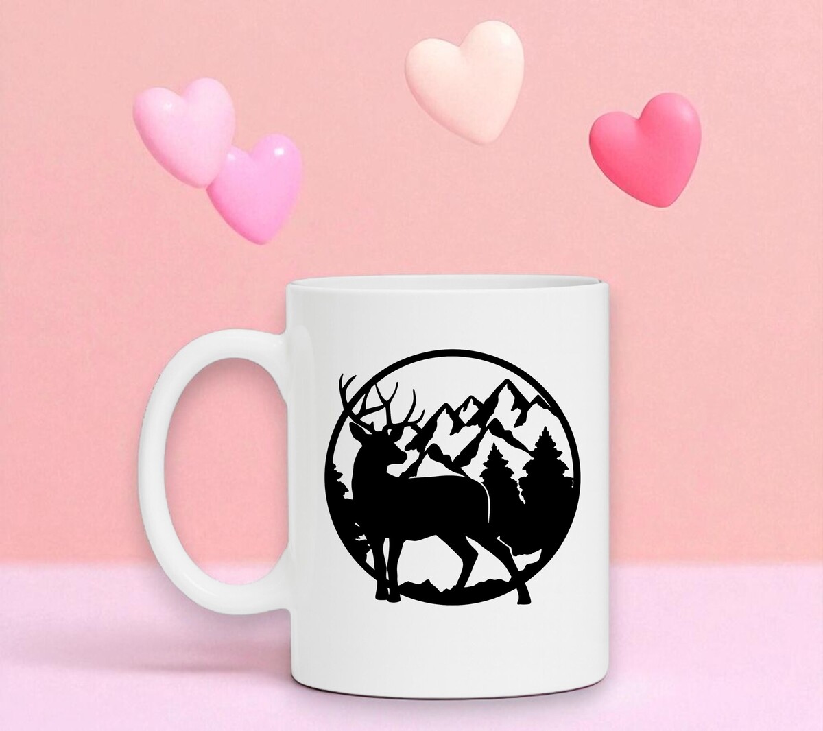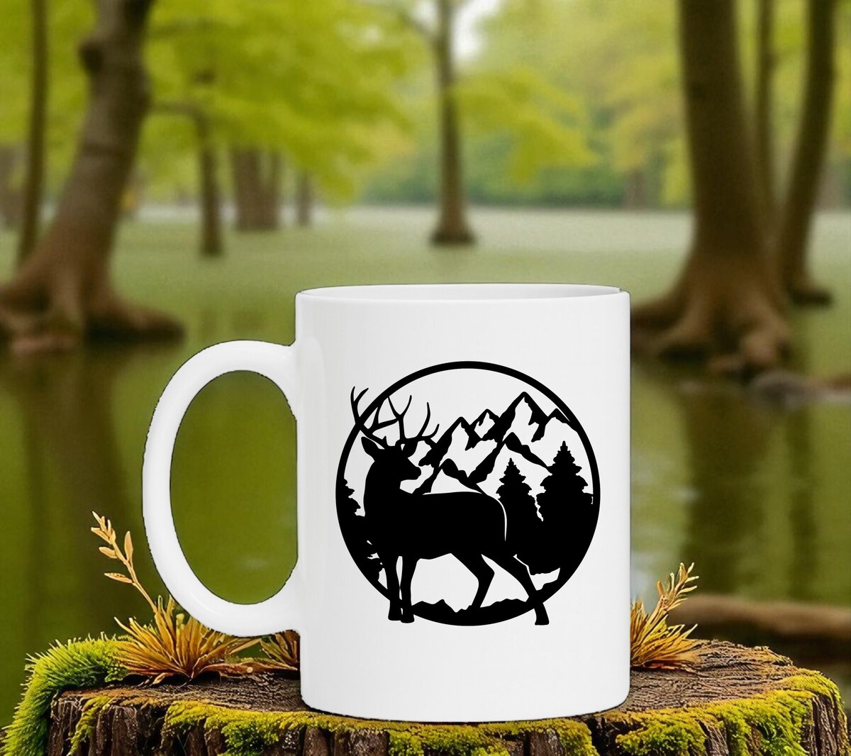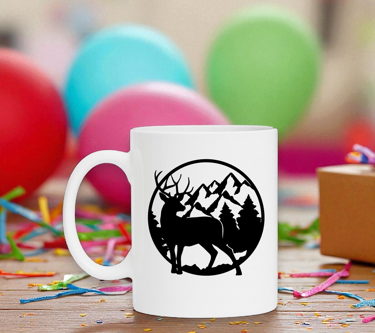 Witte koffie of thee mok met de opdruk van rendier met besneeuwde bergtoppen.