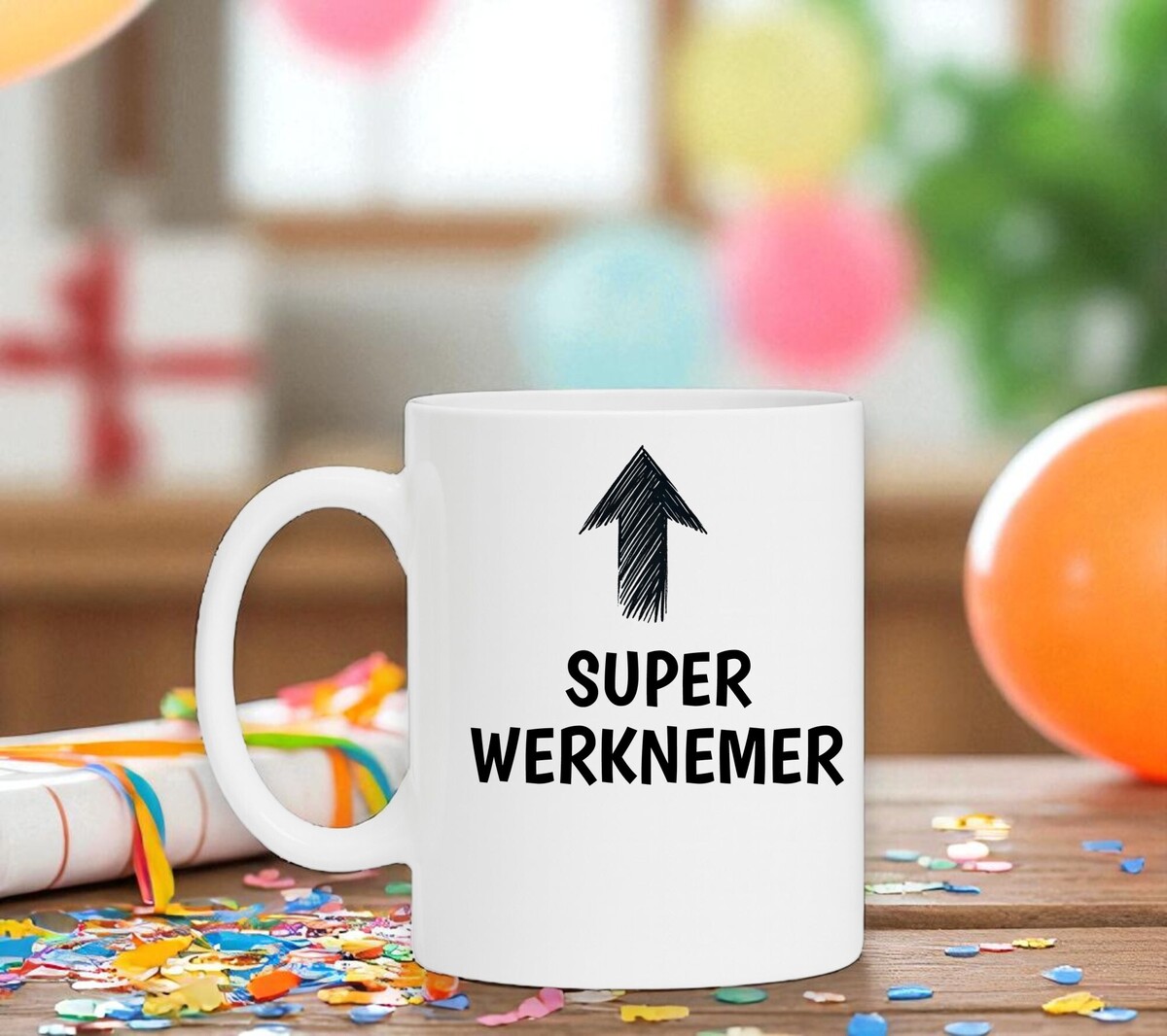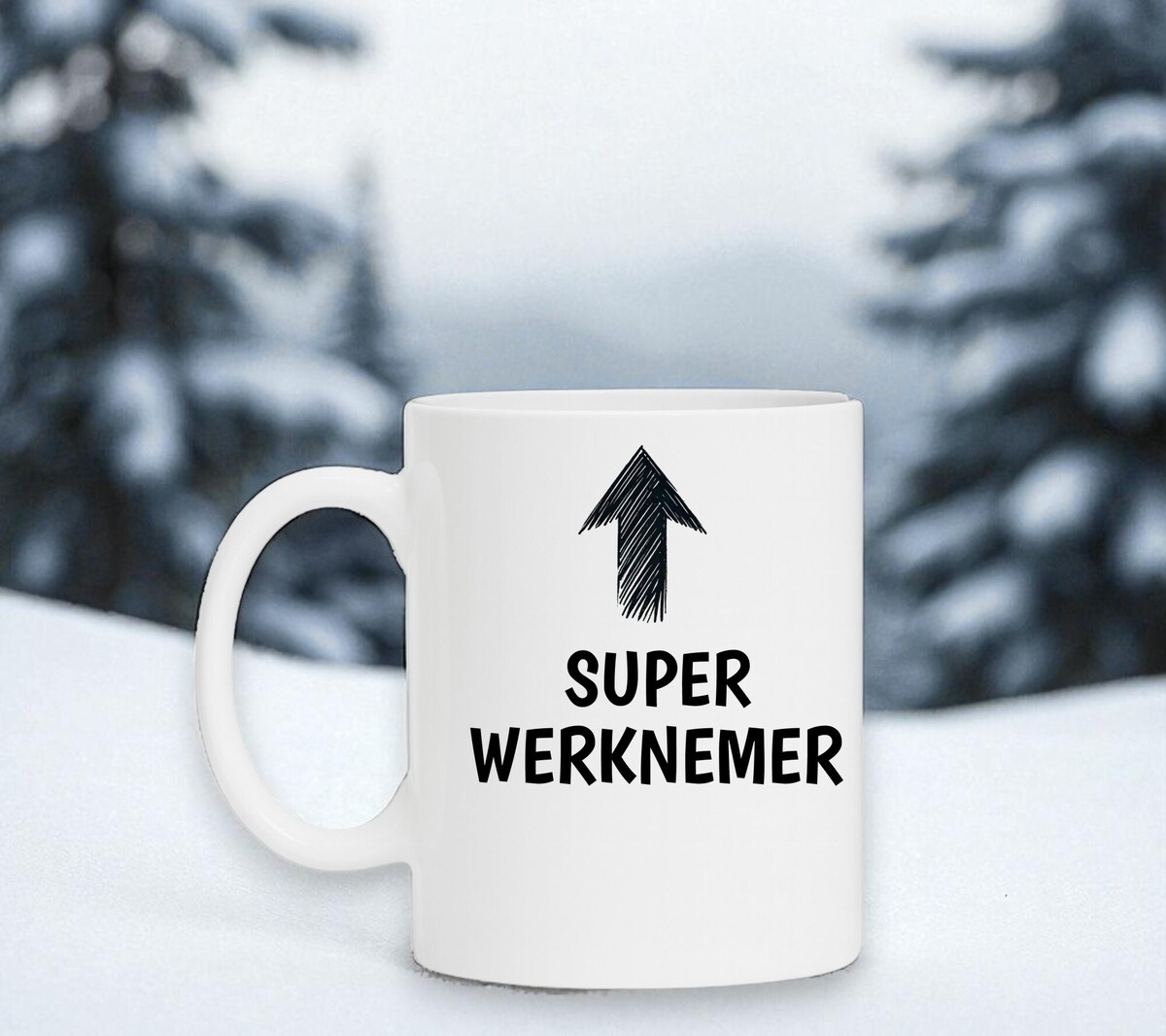 Witte mok voor een super werknemer! De mok is vaatwasserbestendig en heeft een hoogte van 96mm en een diameter van 80mm