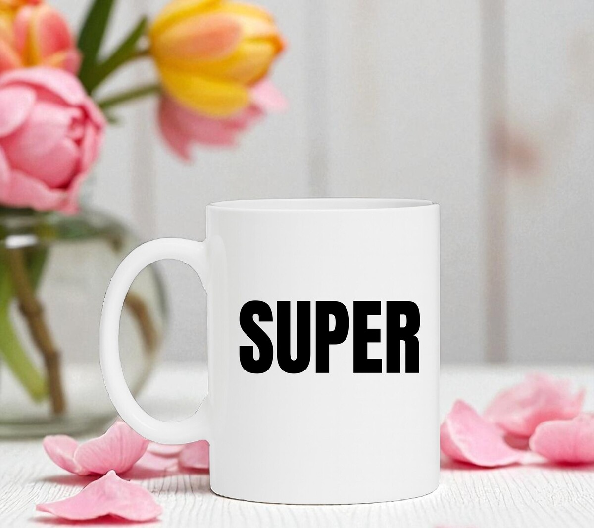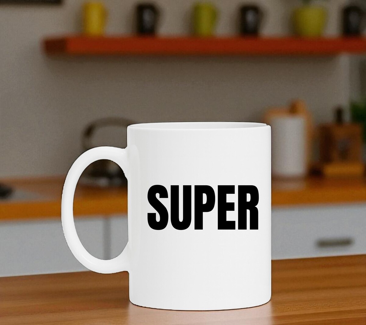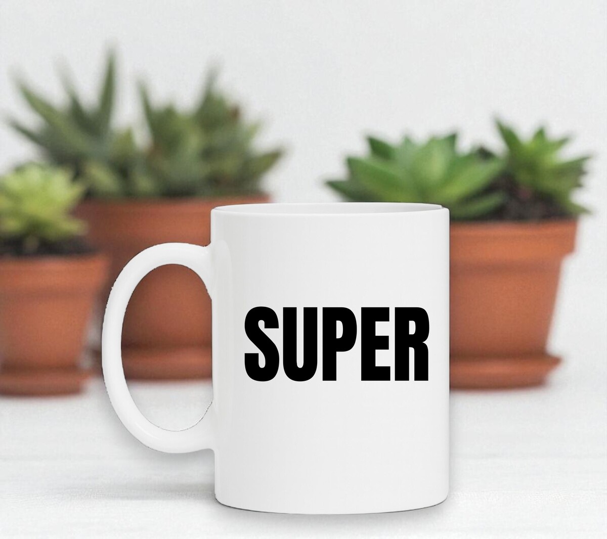 Witte koffiemok of theemok met de opdruk super in grote zwarte letters. De mok is magnetron en vaatwasserbestendig en de witte mok heeft een hoogte van 96mm en een diameter van 80mm.