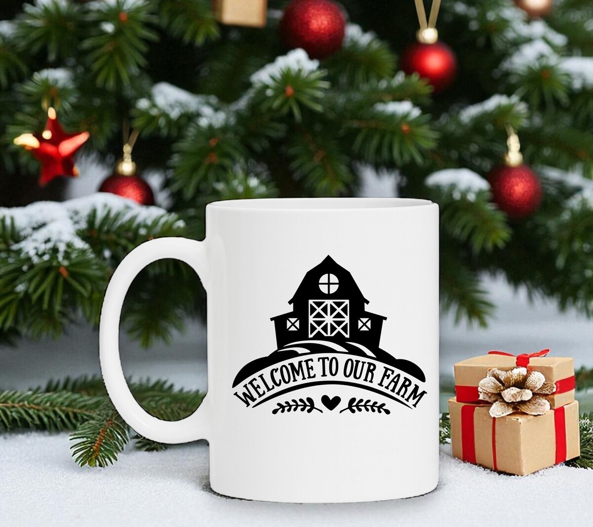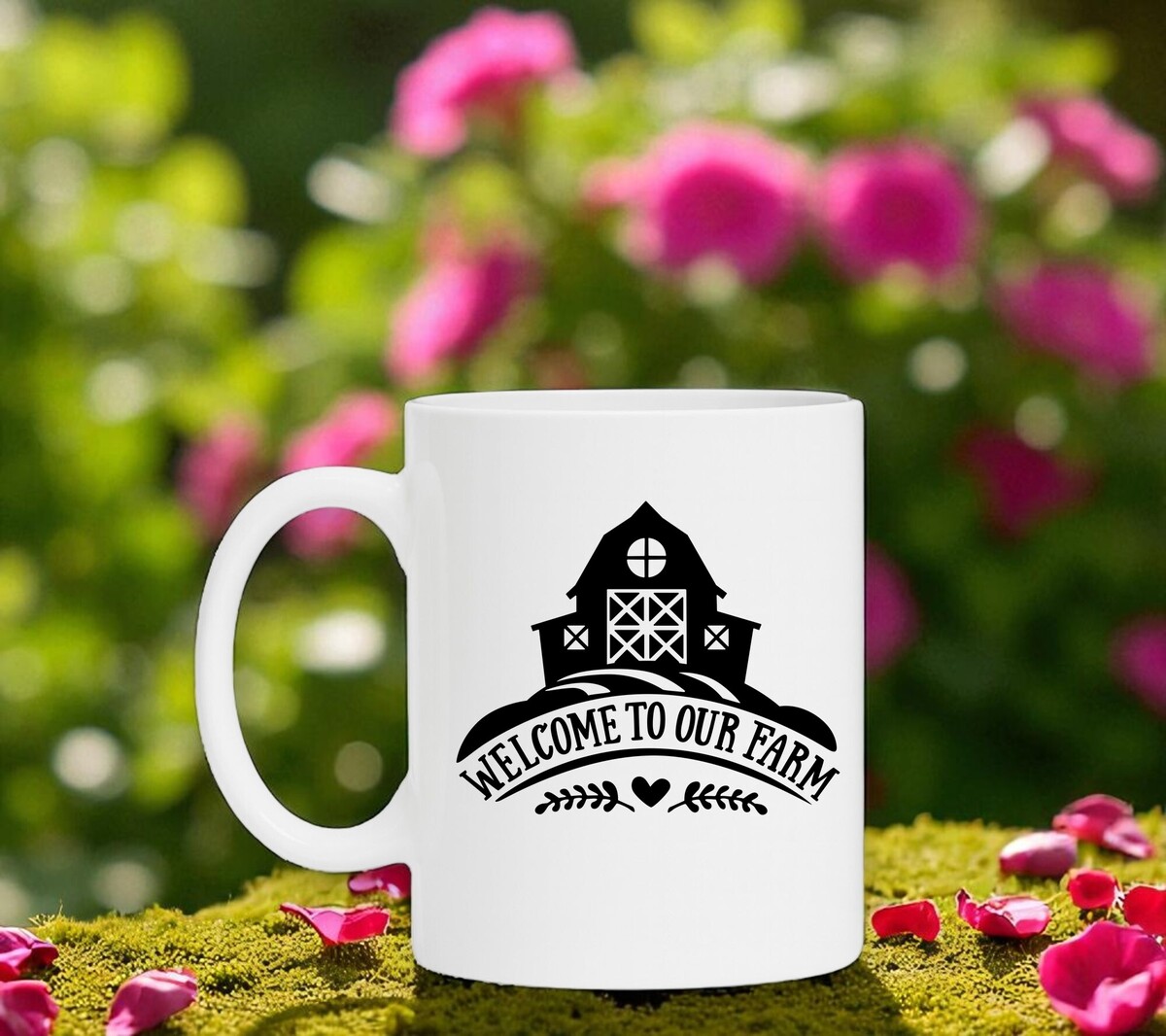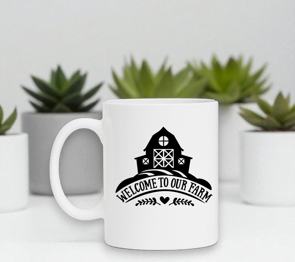 Een mooie witte koffie mok met een prachitge opdruk 'Welcom to our farm'. De mok is vaatwasserbestendig en magnetronbestendig en heeft een hoogte van 96mm en een diameter van 80mm.
