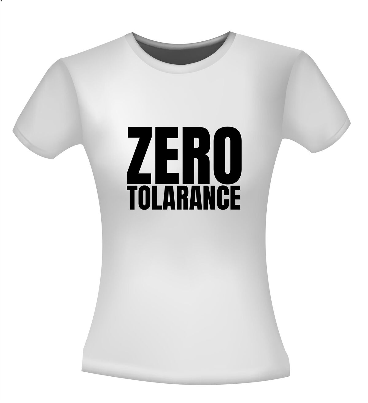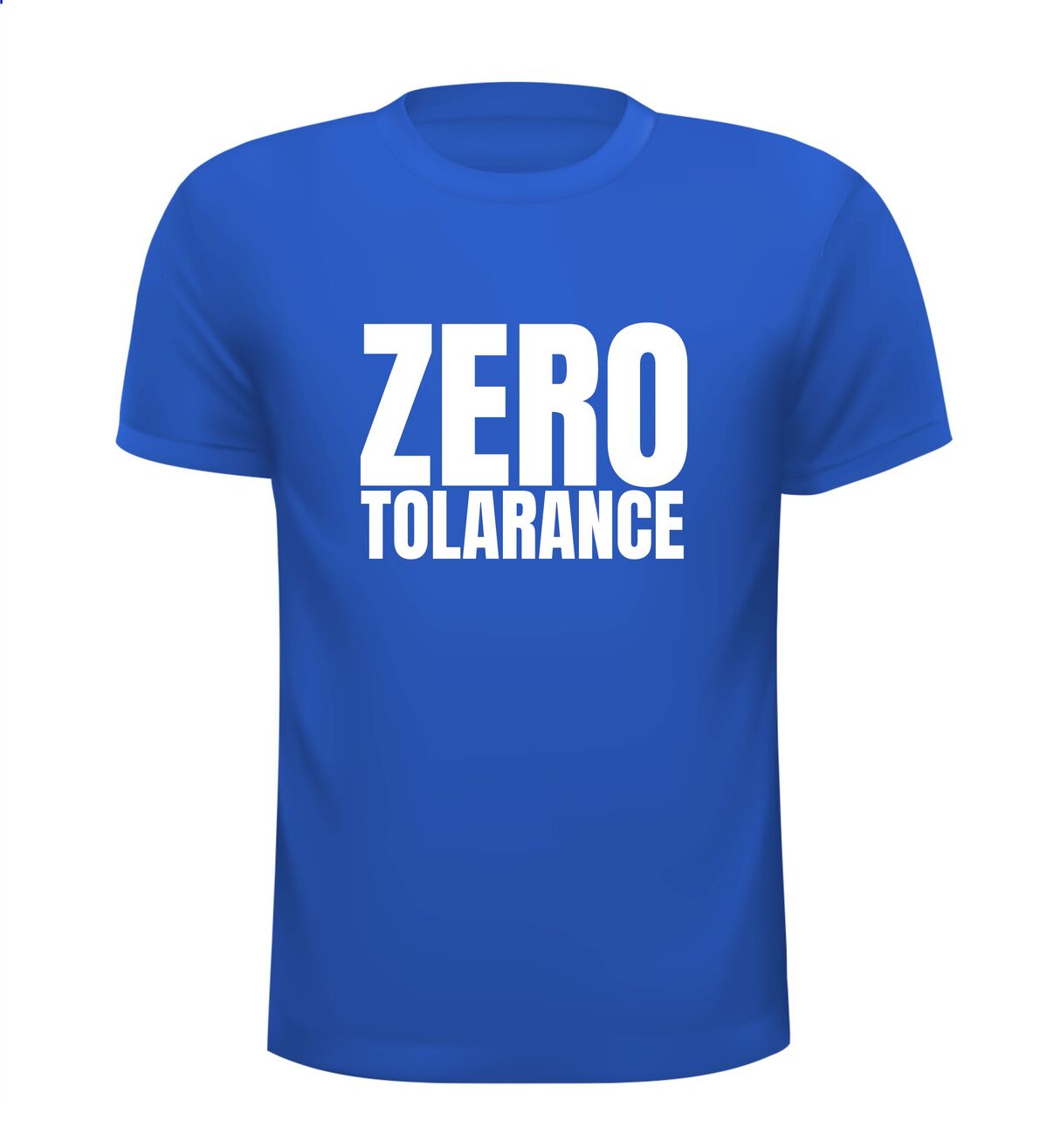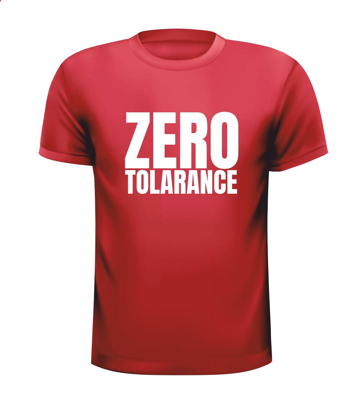 T-shirt Zero tolerance. Een nultolerantiebeleid (Engels: zero-tolerance policy; in Nederland meestal zero tolerance beleid genoemd) is een beleid waarbij zelfs het kleinste vergrijp (hard) bestraft wordt. Hierop is dit t-shirt gebaseerd.