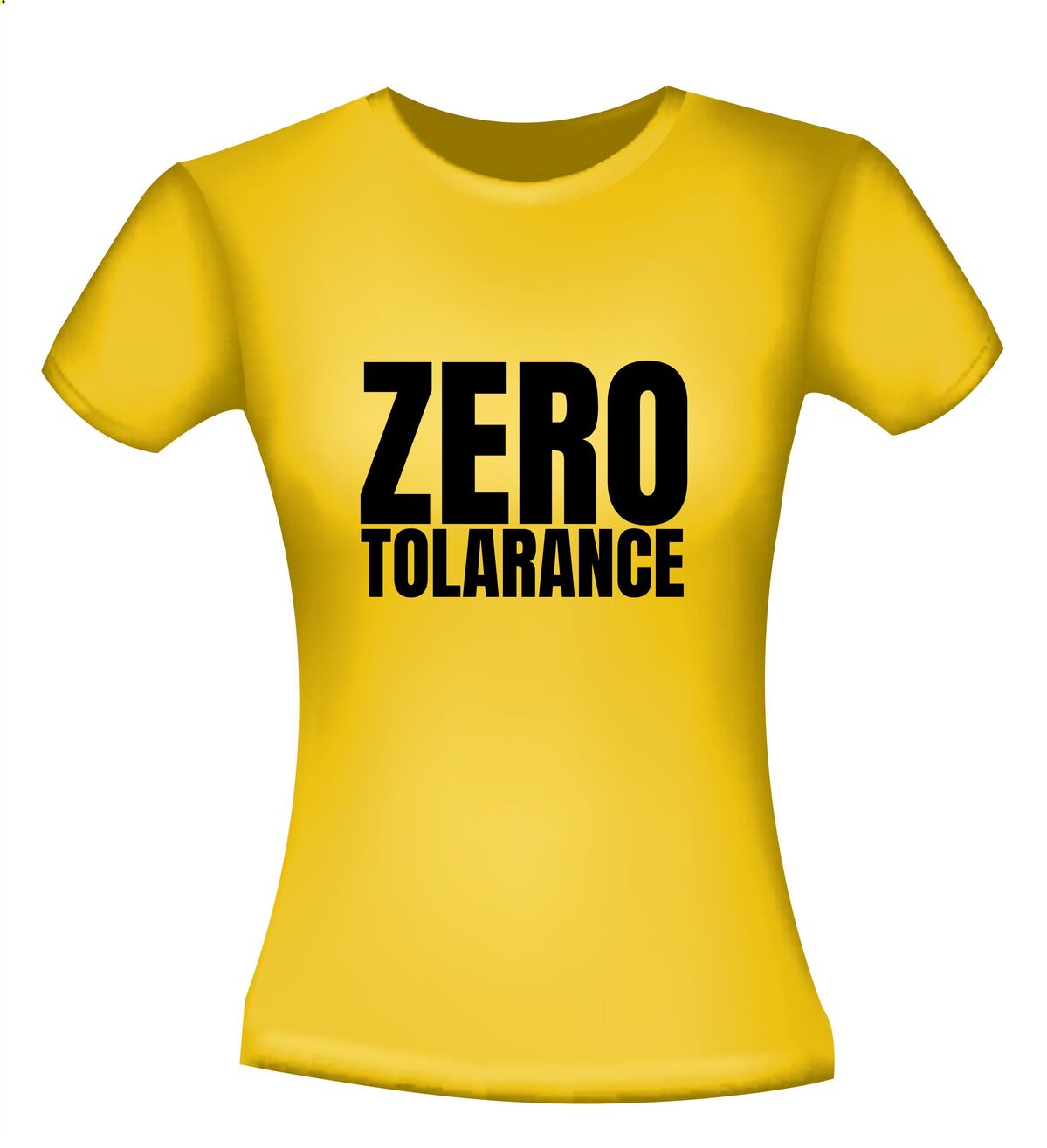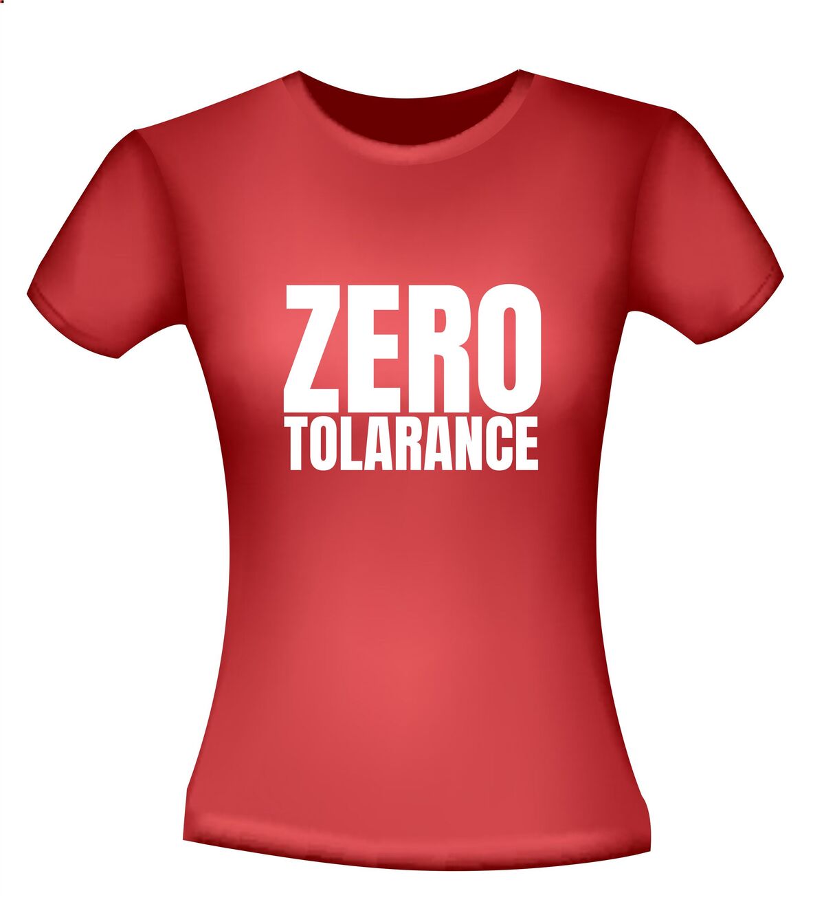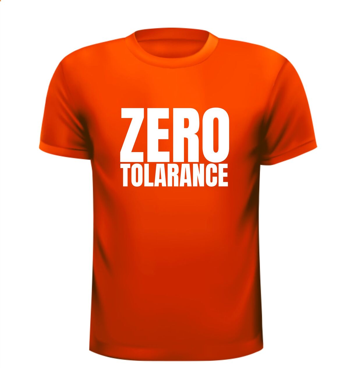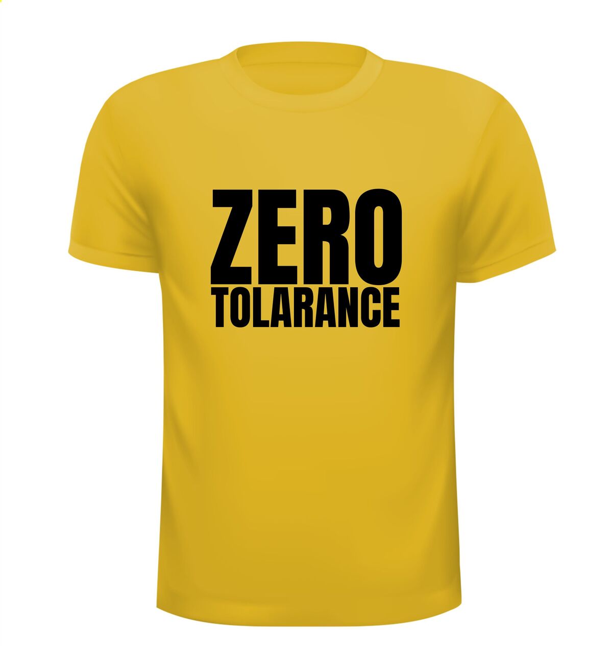 T-shirt Zero tolerance. Een nultolerantiebeleid (Engels: zero-tolerance policy; in Nederland meestal zero tolerance beleid genoemd) is een beleid waarbij zelfs het kleinste vergrijp (hard) bestraft wordt. Hierop is dit t-shirt gebaseerd.