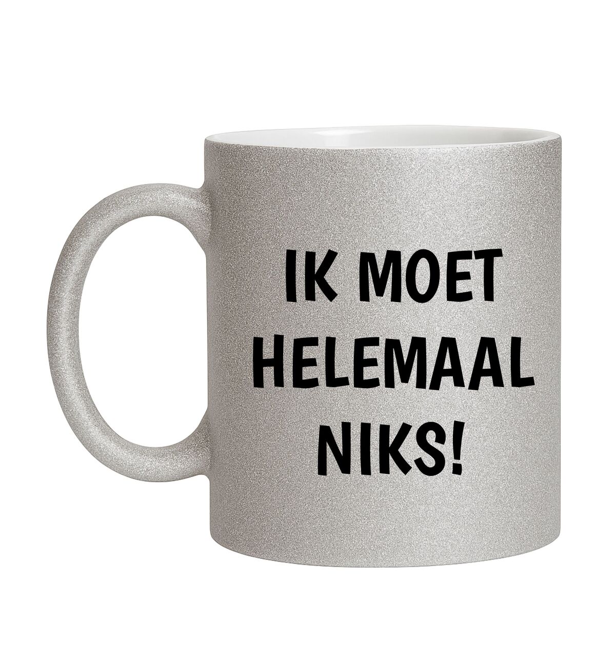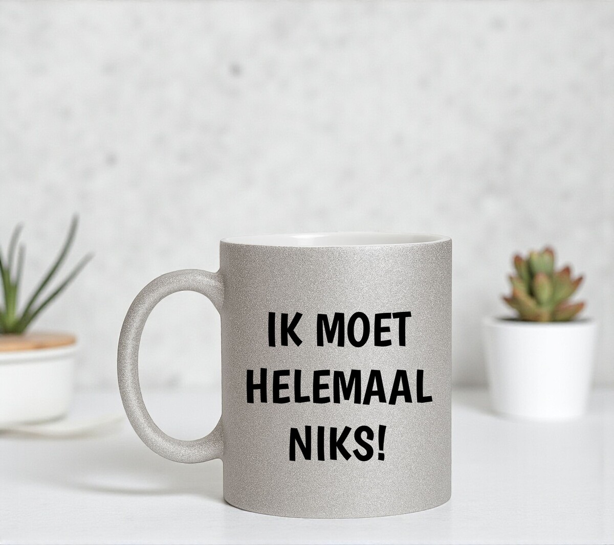 De zilveren glittermok heeft een hoogte van 96 mm, een diameter van 80 mm en een inhoud van circa 330 ml. Door de glittercoating is deze mok niet geschikt voor de magnetron en wordt handwas aanbevolen om de opdruk en glans te behouden.