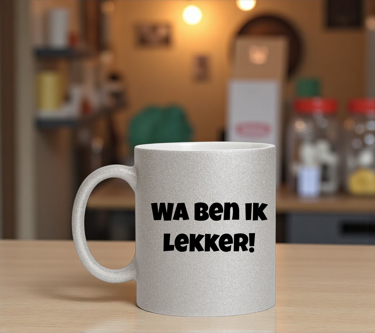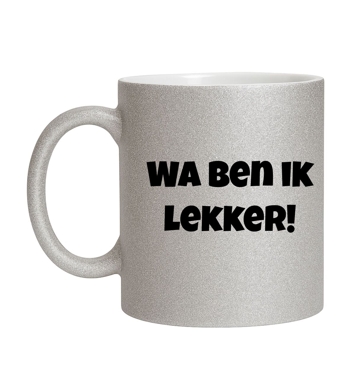 De zilveren glittermok heeft een hoogte van 96 mm, een diameter van 80 mm en een inhoud van circa 330 ml. Door de glittercoating is deze mok niet geschikt voor de magnetron en wordt handwas aanbevolen om de opdruk en glans te behouden.