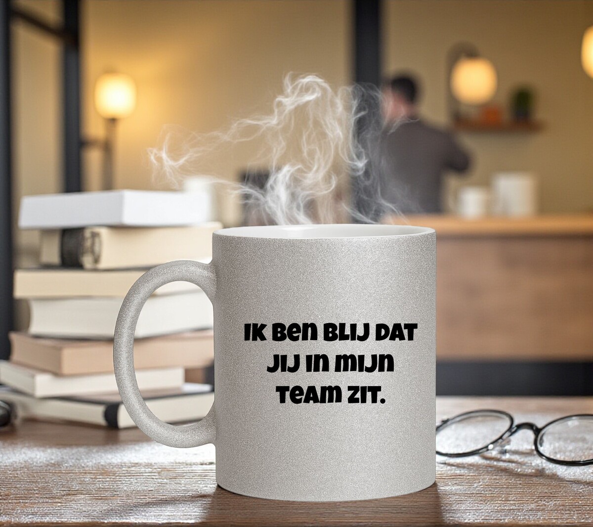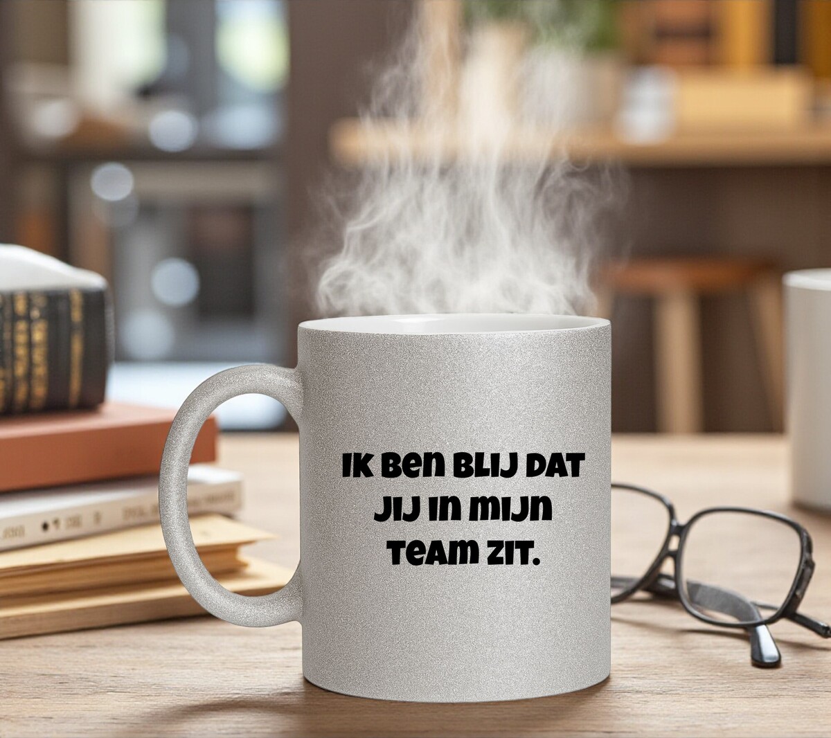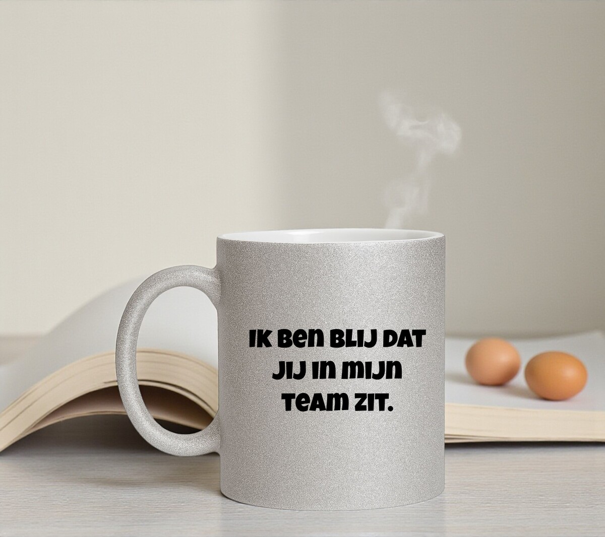 Deze zilveren glitter mok met de tekst “Ik ben blij dat jij in mijn team zit” is het perfecte bedankje voor collega’s, medewerkers of partners die een verschil maken.