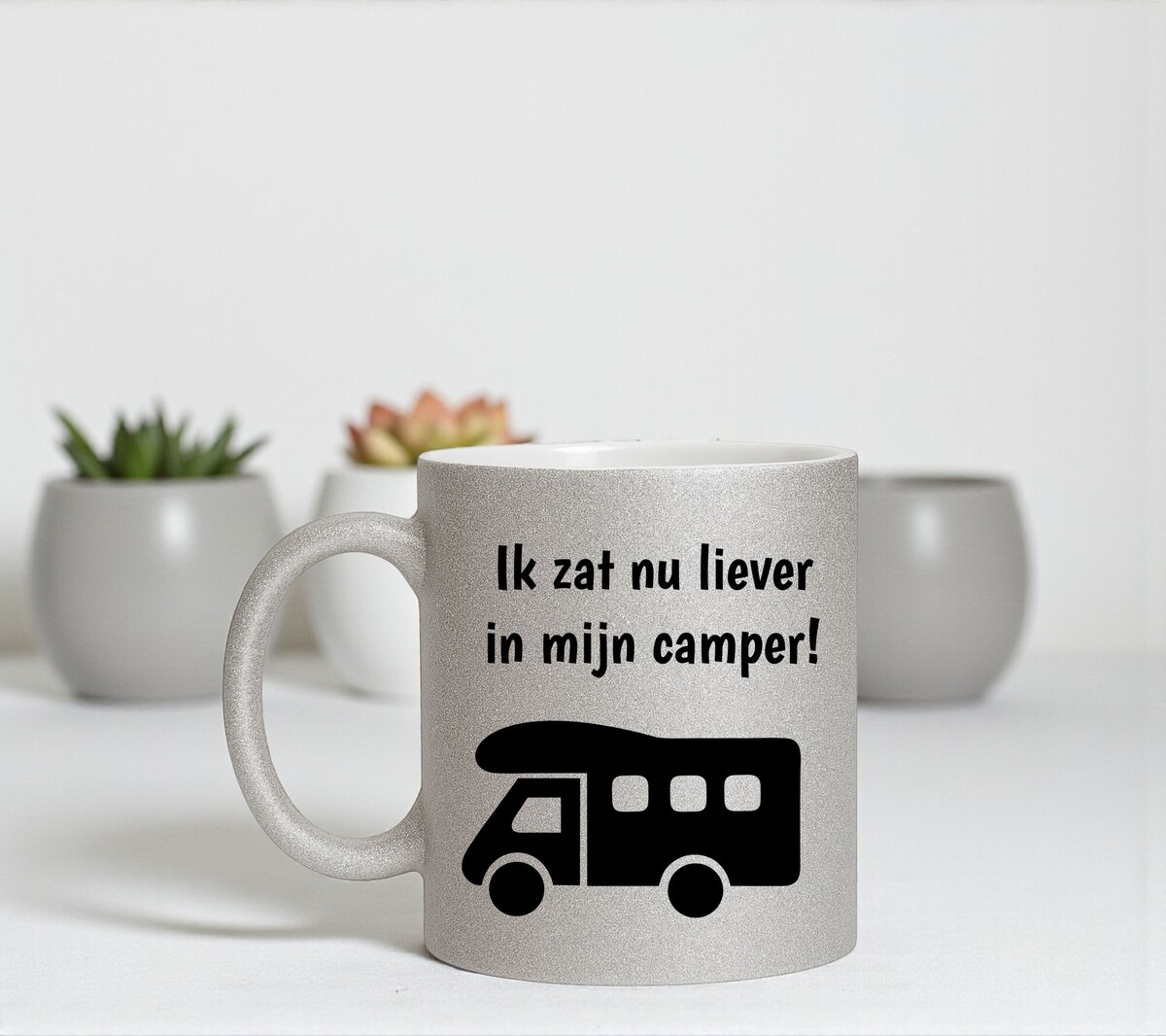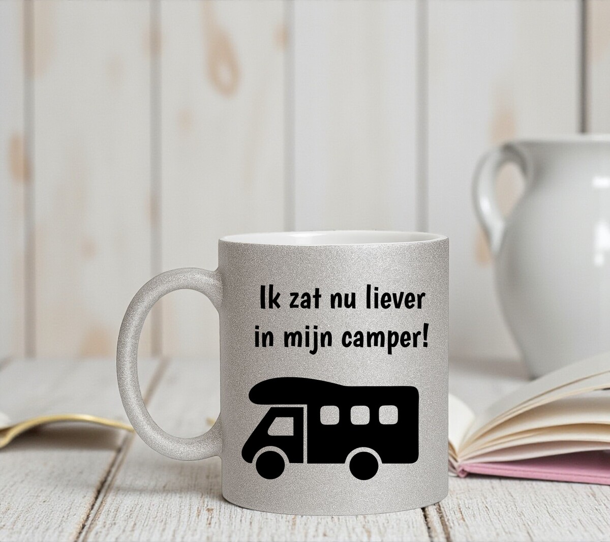 Deze glitter zilvere mok met de tekst "Ik zat liever in mijn camper" is dé must-have voor elke echte camperliefhebber. Of je nu droomt van je volgende roadtrip, geniet van je koffie met uitzicht op de bergen, of gewoon even weg wilt uit de dagelijkse sleur – deze mok zegt precies wat jij denkt.