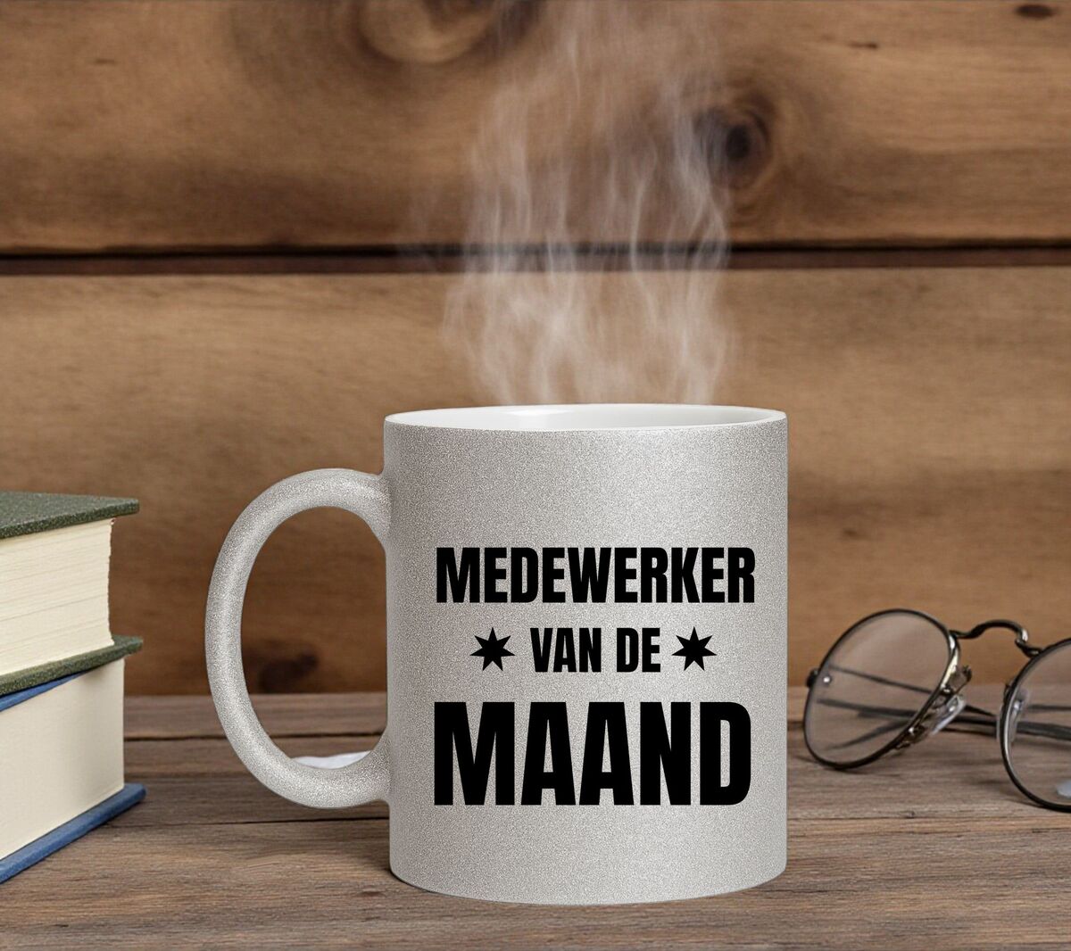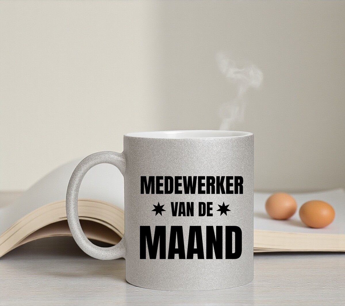 Zet je collega, vriend(in) of jezelf eens in het zonnetje met deze glitter zilveren mok met de tekst “Medewerker van de Maand”