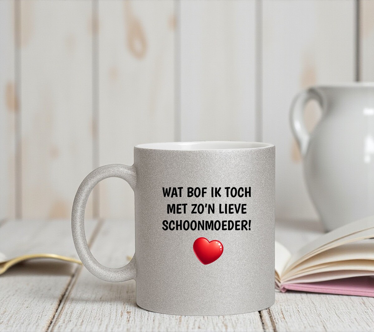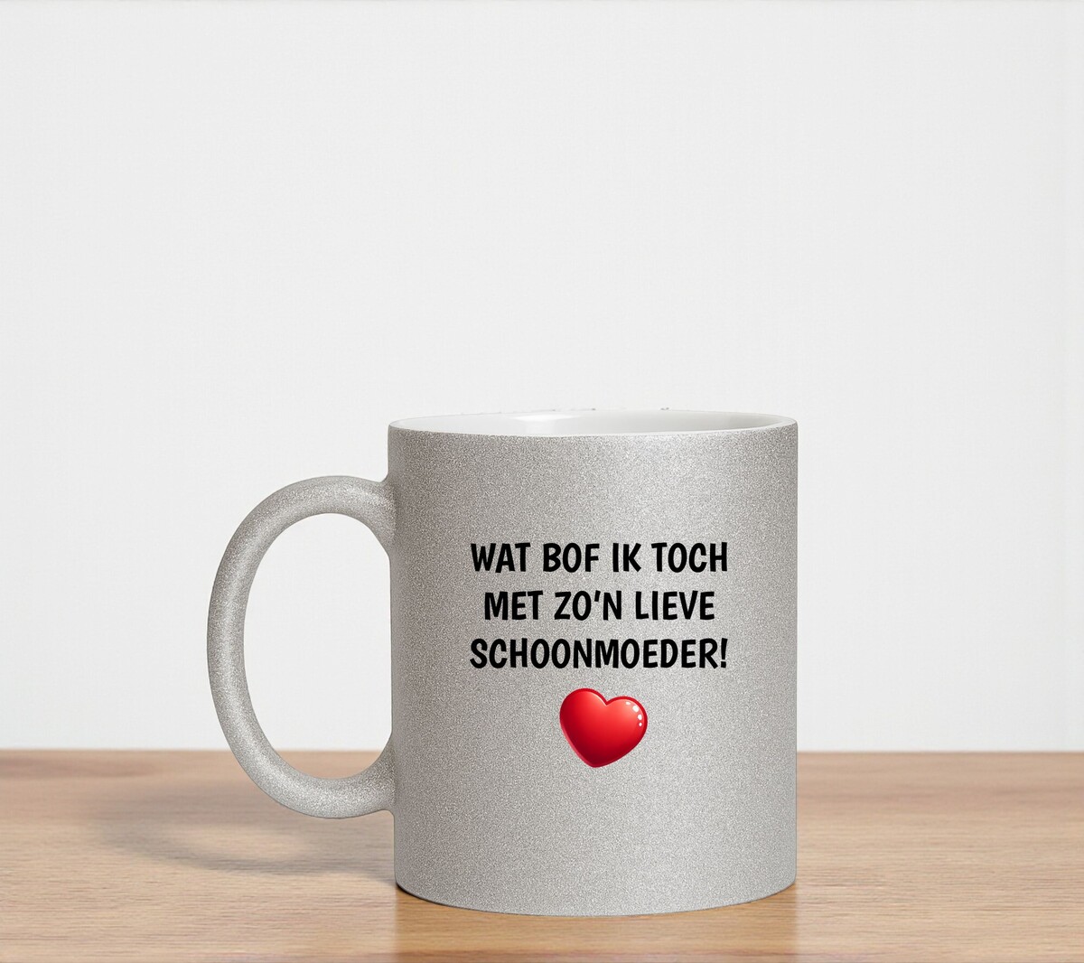 Geef jouw schoonmoeder een cadeautje dat net zo sprankelt als zij (of in elk geval net zo hard schittert als jij wilt doen geloven). Deze glitter zilveren mok met de tekst “Wat bof ik toch met zo’n schoonmoeder” en een lief hartje is hét perfecte cadeau voor verjaardagen, feestdagen, moederdag, of gewoon om punten te scoren wanneer dat goed uitkomt.