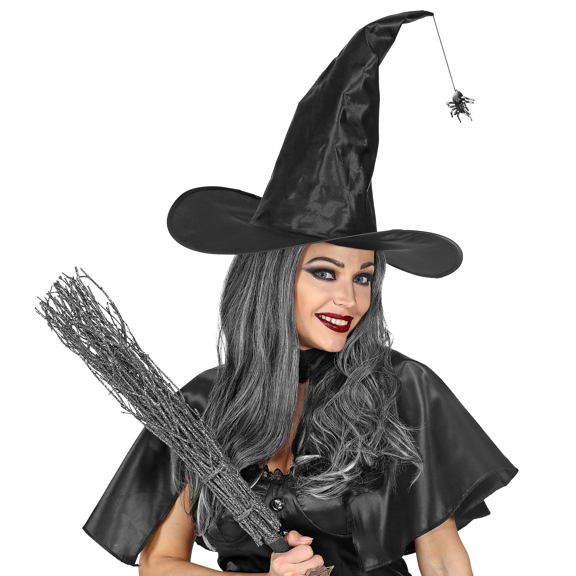 Aan deze zwarte heksenhoed bungeld een spin. geheel in halloween stijl.